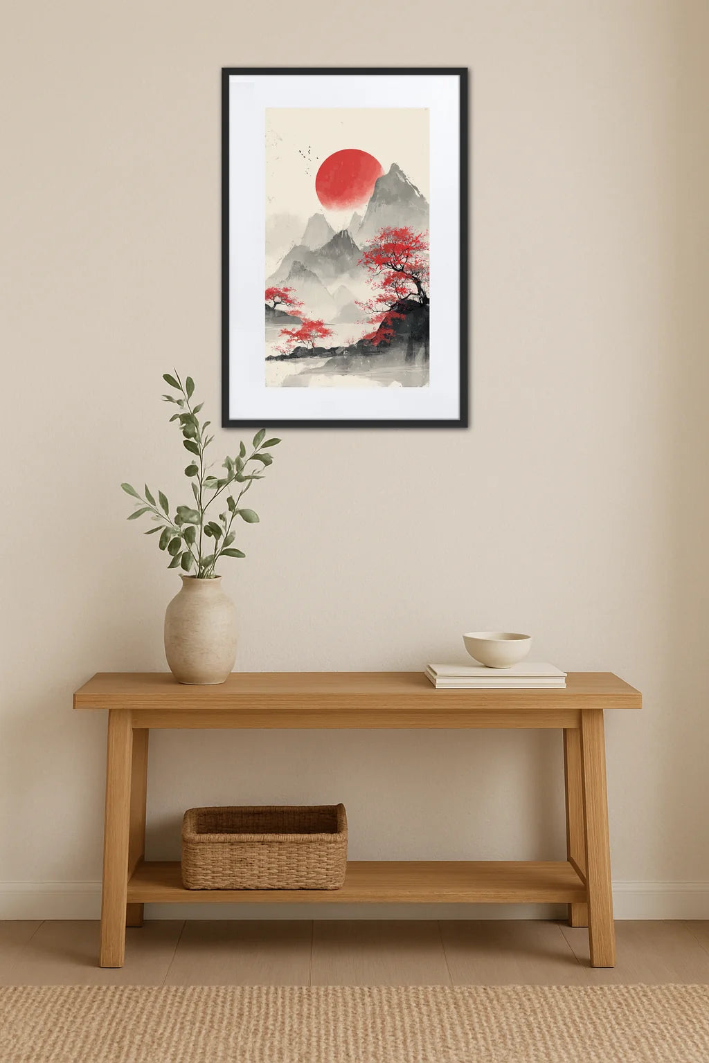 Ce tableau puise son essence dans l’art traditionnel japonais, où la nature est sublimée par une simplicité poétique et une profondeur symbolique. Le soleil rouge, emblème puissant, évoque à la fois la vie, la force et le passage du temps, tandis que les montagnes, silhouettes imposantes, rappellent la permanence face à l’éphémère. Les arbres aux feuilles rougeoyantes incarnent le cycle des saisons, un hommage à la beauté fugace de l’instant présent. À travers cette composition, l’artiste joue avec les contrastes entre les formes nettes et les zones estompées, suggérant un monde en équilibre entre réalité et rêve. Le minimalisme apparent cache une richesse d’émotions, une invitation à s’abandonner à la sérénité des paysages nippons et à la méditation. Ce tableau n’est pas seulement un décor, c’est une porte ouverte vers une culture millénaire, un chant visuel qui célèbre la rencontre entre l’homme et la nature, la lumière et l’ombre, la tradition et la modernité. Chaque regard posé sur cette œuvre révèle un nouveau détail, une nuance, une histoire secrète, renforçant ce lien intime entre l’observateur et l’univers qu’elle dépeint.