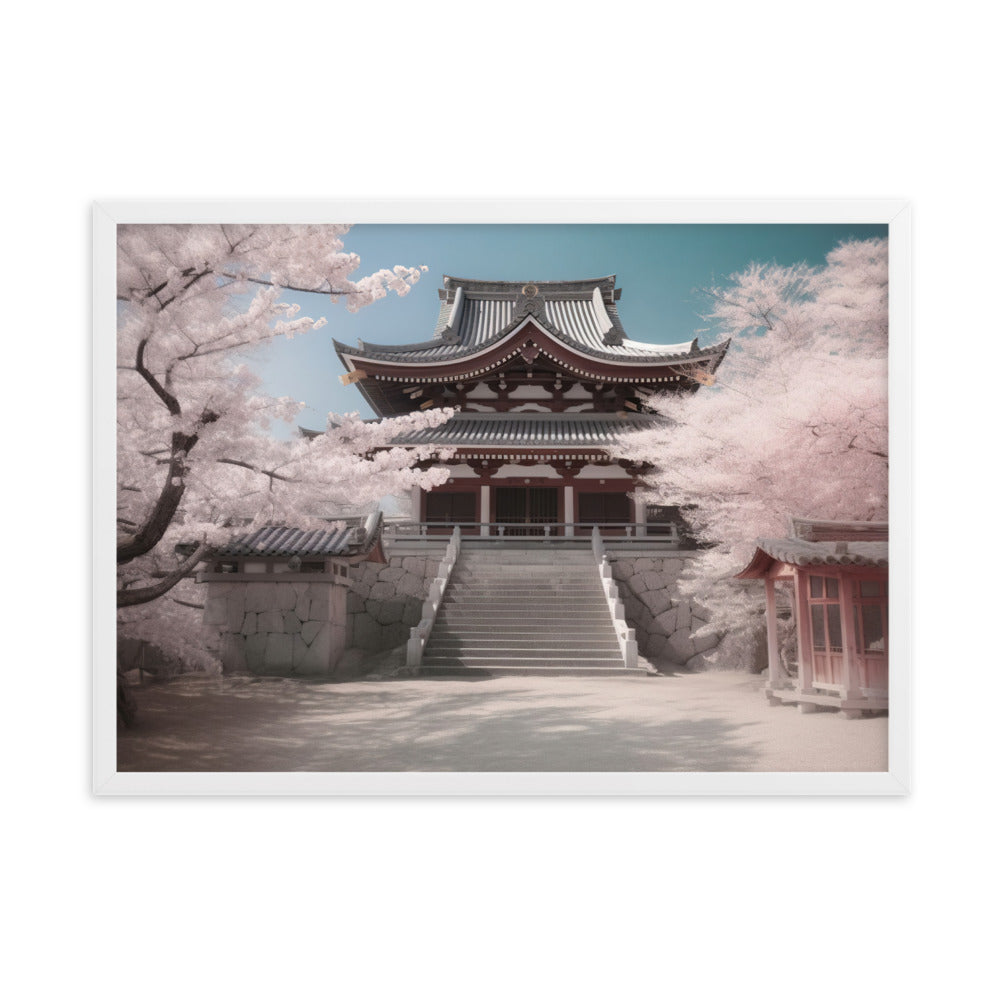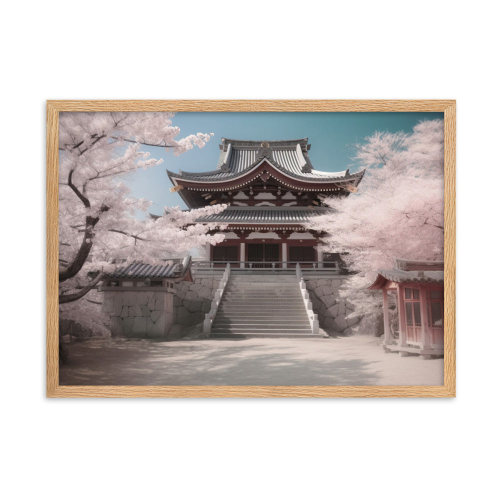 Ce tableau japonais vous transporte dans un univers poétique et mystique avec son arbre de cerisier en fleur et sa vue imprenable sur un temple. Les nuances de rose et de blanc des fleurs apportent une touche de douceur à cette représentation artistique.