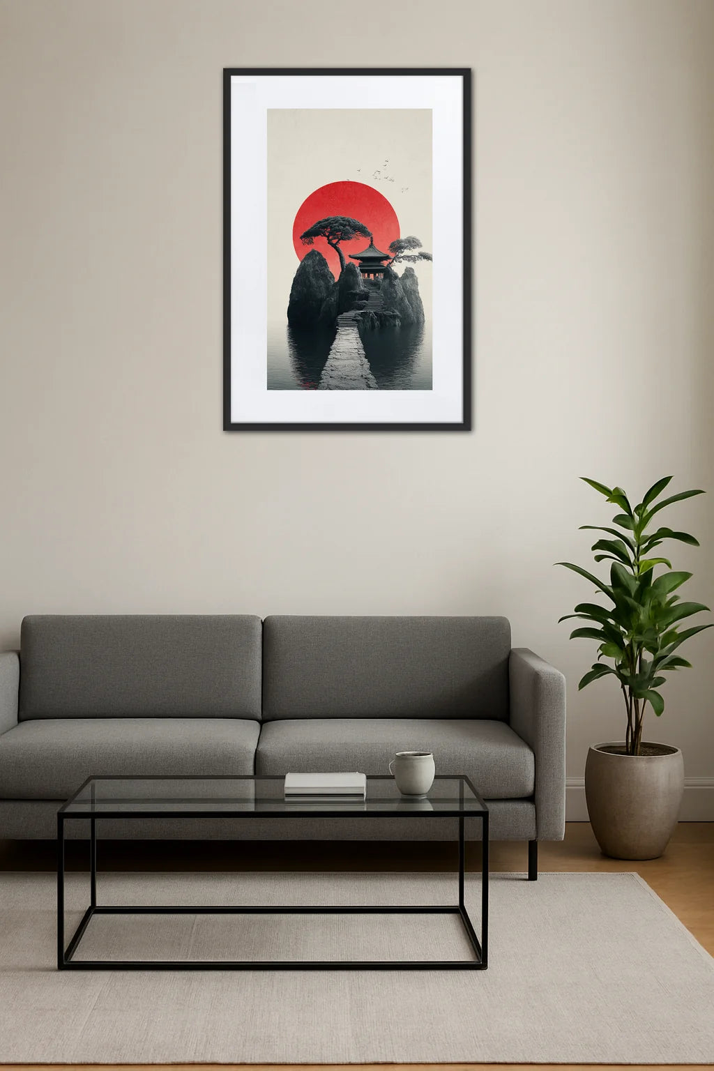 Cette œuvre transporte au cœur d’un paysage où le temps semble s’arrêter, sous l’omniprésence d’un disque solaire rouge éclatant, symbole ancestral du Japon. L’atmosphère délicate, presque méditative, est portée par les silhouettes épurées des pins et des rochers, qui encerclent ce chemin de pierre menant à un pavillon isolé. Ce tableau évoque l’équilibre fragile entre la nature et l’homme, cher à la culture japonaise, où chaque élément porte un sens profond. La composition, à la fois minimaliste et puissante, dialogue avec l’espace qu’elle habite, insufflant une énergie apaisante et une invitation à la réflexion intérieure. Les oiseaux, légers, s’élèvent au-dessus de cette scène, apportant un souffle de liberté et de mouvement. Inspirée des estampes traditionnelles, l’œuvre revisite ces codes avec un regard contemporain, jouant sur les contrastes et la symbolique pour créer un univers à la fois intemporel et résolument moderne. L’essence même du Japon se révèle dans cette représentation où la simplicité devient poésie, où la chambre devient un sanctuaire propice à la sérénité et à l’évasion.