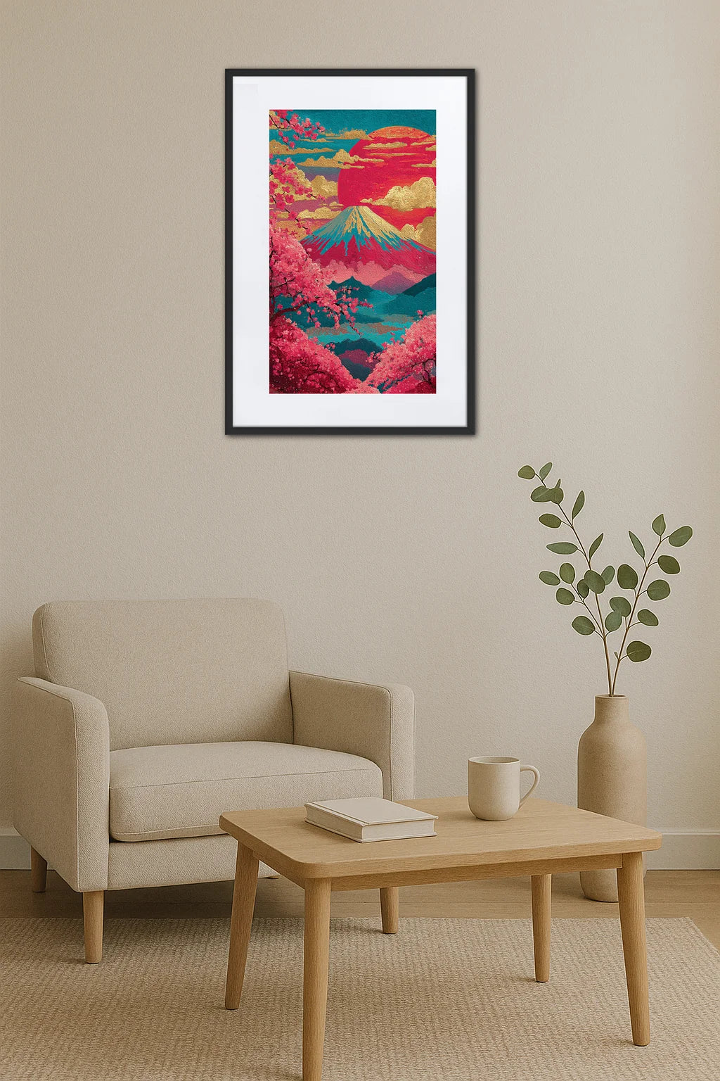 Ce tableau japonais coloré s’inspire profondément des paysages emblématiques du Japon, où le Mont Fuji trône majestueusement, enveloppé par la floraison intense des cerisiers. L’œuvre capte la dualité entre le calme ancestral et l’énergie contemporaine, incarnée par les nuances audacieuses du ciel et des nuages dorés. Chaque élément y est symbolique : le soleil rouge, presque surnaturel, évoque la puissance vitale et l’héritage sacré du pays du Soleil-Levant. Les fleurs de cerisier, en pleine explosion de couleurs, incarnent la fragilité et la beauté éphémère, rappelant la poésie du moment présent si chère à la culture japonaise. Le contraste entre les monts apaisants et les touches flamboyantes de la nature souligne un équilibre délicat entre force et douceur. Cette composition transporte le spectateur dans un voyage sensoriel où l’histoire, la culture et l’émotion se rencontrent. Le regard se perd dans les détails, entre la précision de la montagne et la spontanéité des branches en fleurs, comme une invitation à plonger dans une rêverie qui transcende le temps. Plus qu’une simple représentation, ce tableau est une célébration vibrante de la vie, un pont entre passé et présent, tradition et audace.