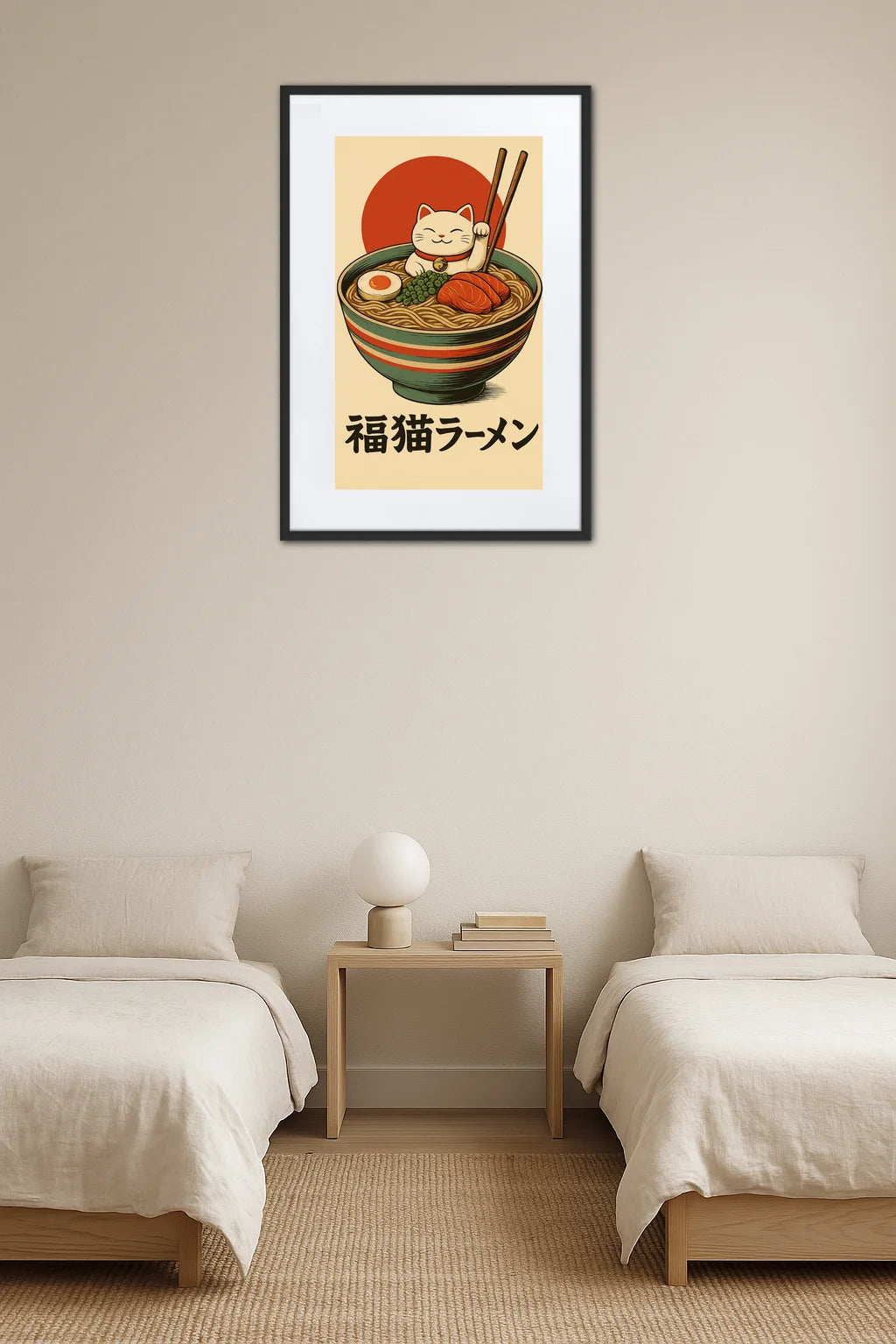 Dans ce tableau, la simplicité apparente dissimule une richesse culturelle profonde. Le maneki-neko, ce chat porte-bonheur levé de la patte, s'élève au-dessus d’un bol généreux de ramen, évoquant la fusion entre chance et partage. L’œuvre célèbre l’art de vivre japonais où chaque repas est un rituel, un moment suspendu entre tradition et modernité. Le rouge du soleil levant en arrière-plan symbolise l’énergie et la renaissance, tandis que les éléments du plat — œuf, saumon, légumes — rappellent la minutie et le respect apportés à la cuisine. La scène capte un instant de bonheur simple, celui de la satisfaction d’un repas réconfortant, empreint d’une douceur presque méditative. C’est une invitation à ralentir, à savourer le présent, tout en s’immergeant dans une esthétique qui mêle avec grâce culture populaire et raffinement. Par sa composition équilibrée et ses traits nets, ce tableau transcende l’illustration pour devenir une ode à la joie et à la sérénité, à la fois familière et pleine de mystère.