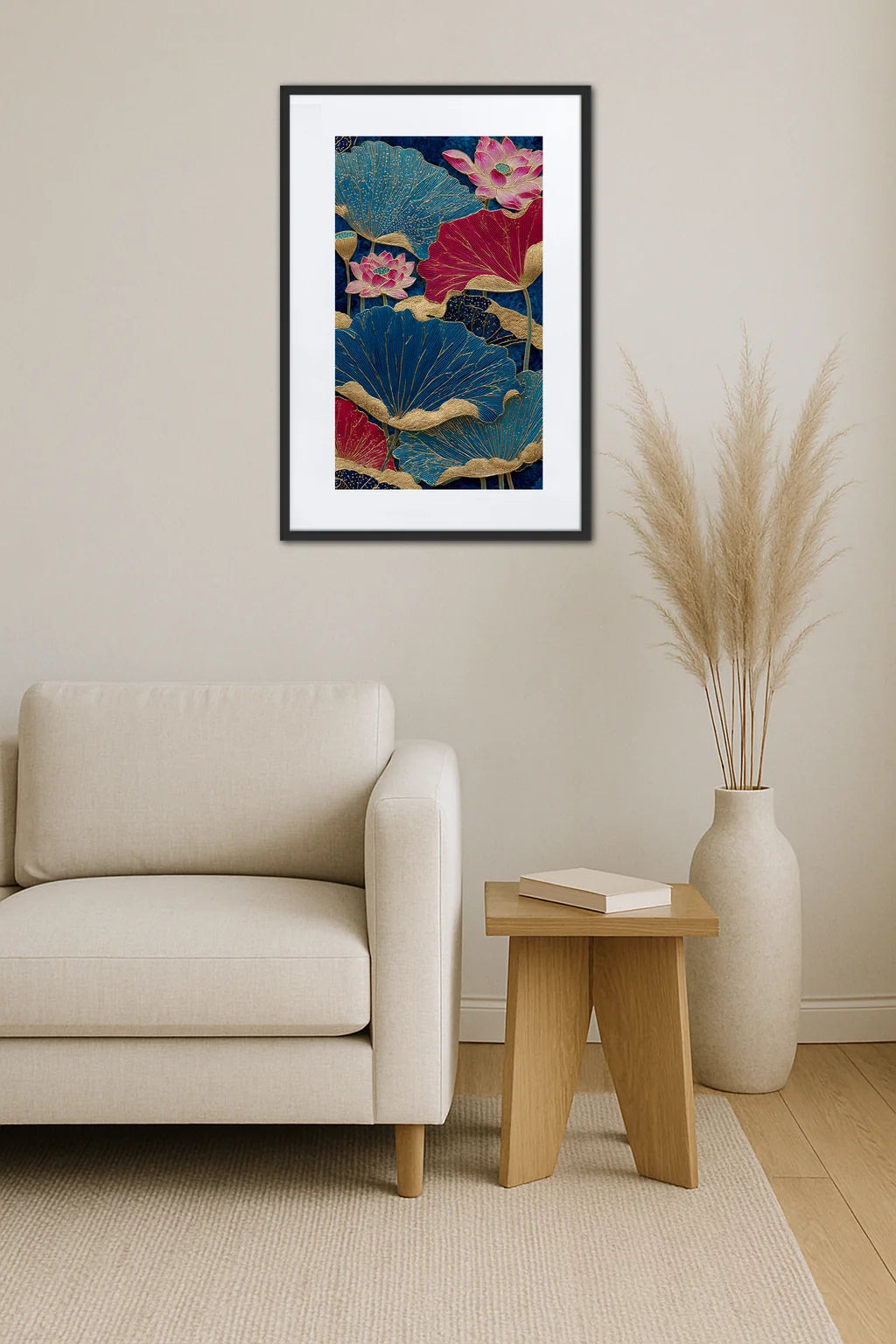 - Un équilibre visuel apaisant : Les formes arrondies des feuilles de lotus créent une douce harmonie qui invite au calme. Cette composition fluide offre un refuge visuel, propice à la méditation et à la sérénité. C’est un véritable havre de paix pour l’âme, au cœur de votre intérieur.