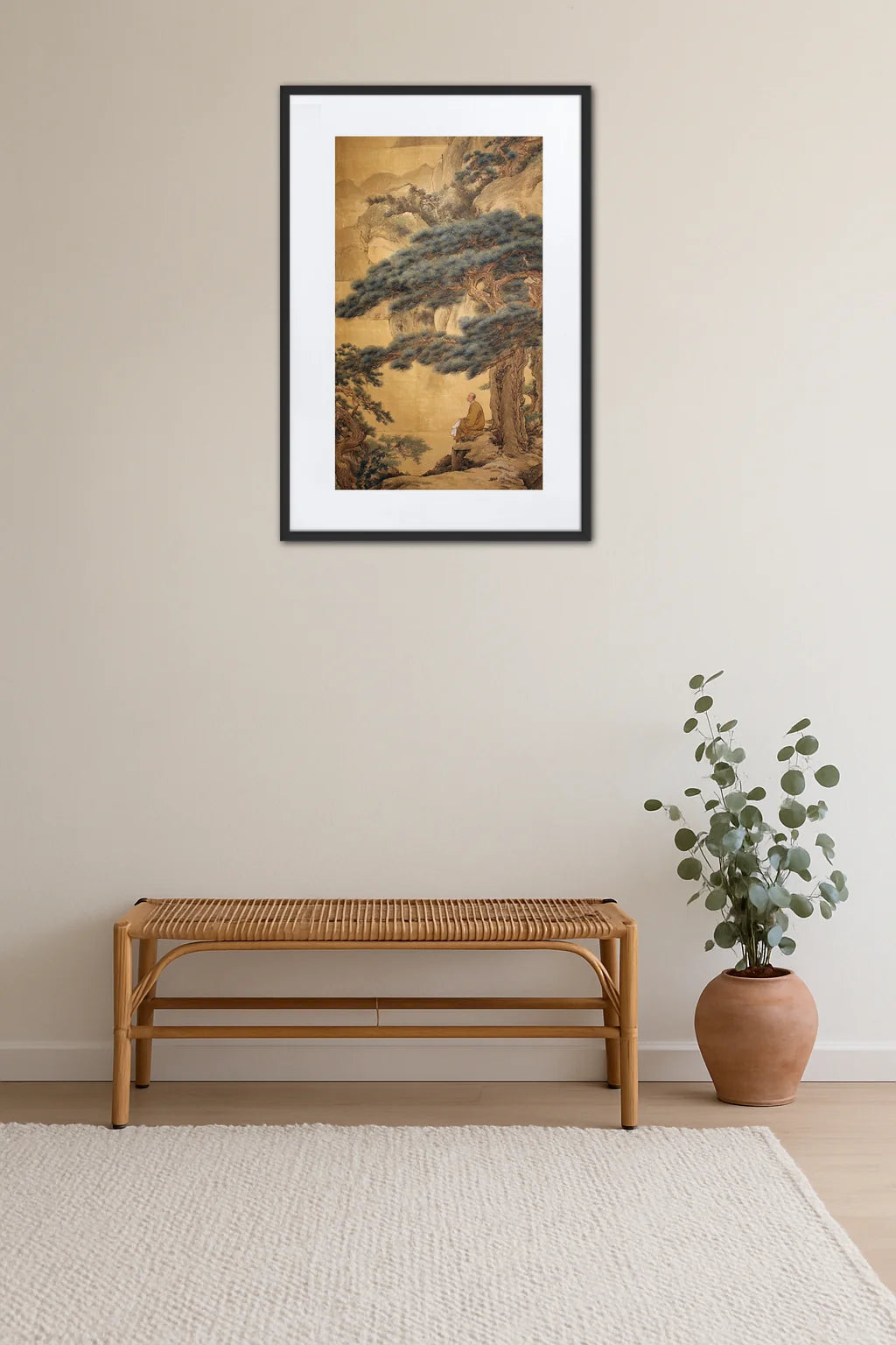 Ce tableau japonais encre nous transporte au cœur d’un paysage où la nature impose sa majesté dans une tonalité chaleureuse presque dorée. La scène révèle un érudit ou un moine assis en pleine méditation, enveloppé par la puissance tranquille d’arbres millénaires aux branches étendues. L’œuvre évoque subtilement la philosophie zen, où le silence et la contemplation se conjuguent pour offrir un refuge face à l’agitation du monde. Ici, chaque détail, du mouvement des branches à la texture des rochers, est une invitation à ralentir, à observer et à ressentir l’équilibre fragile entre l’homme et son environnement. Inspirée par les gravures classiques et les esthétiques traditionnelles, cette composition détourne l’iconographie japonaise en lui insufflant une modernité intemporelle. La réalisation en encre, avec ses nuances subtiles et ses contrastes délicats, accentue la profondeur du tableau, créant une atmosphère presque mystique. L’œuvre devient un pont entre passé et présent, entre art et méditation, où le spectateur est convié à une expérience sensorielle intense, à la fois visuelle et spirituelle.