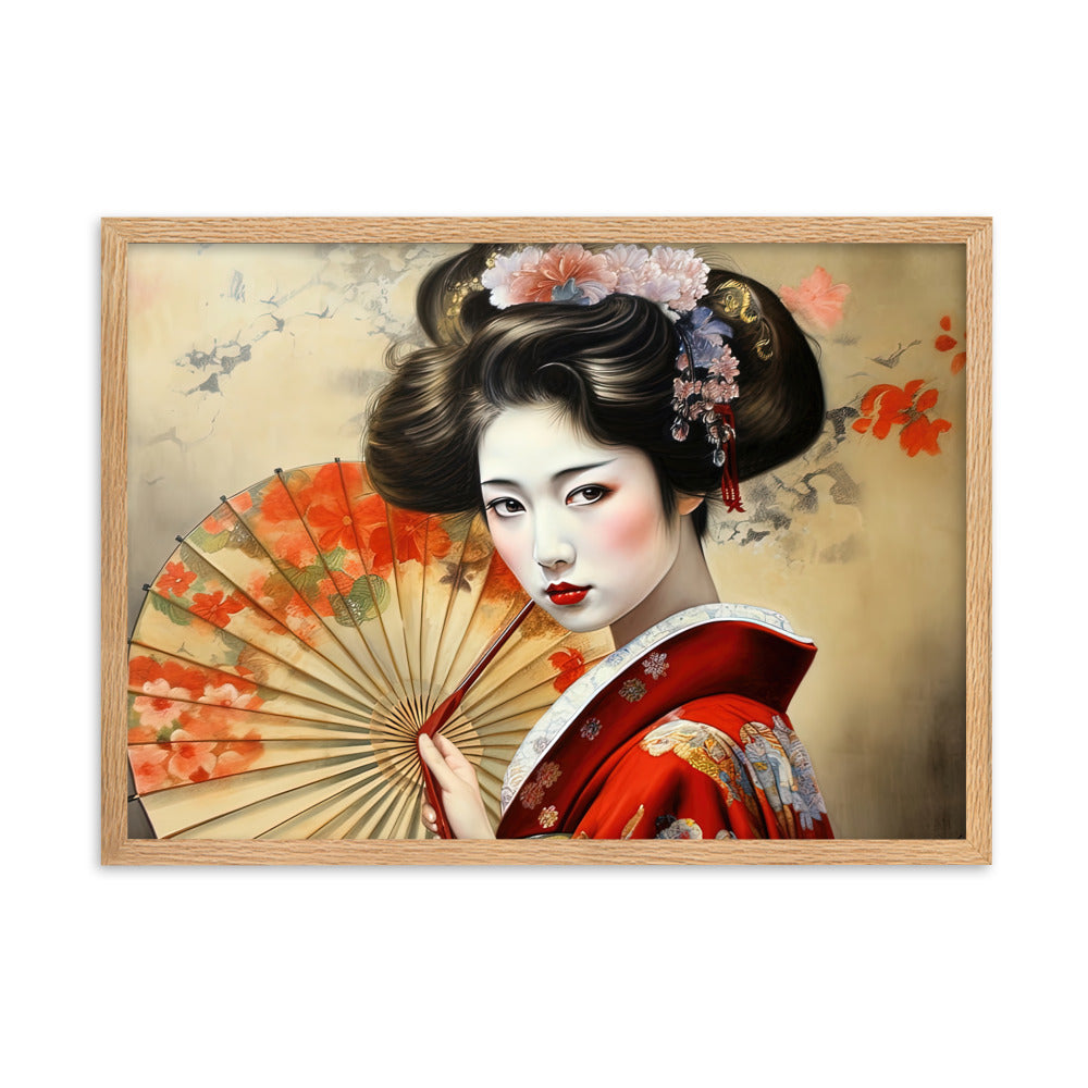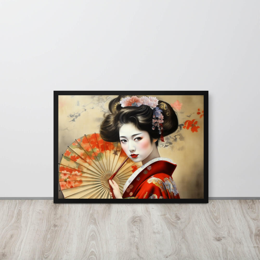 Ce tableau japonais met en scène une geisha, une figure emblématique de la culture japonaise, connue pour sa grâce, sa beauté et son raffinement.