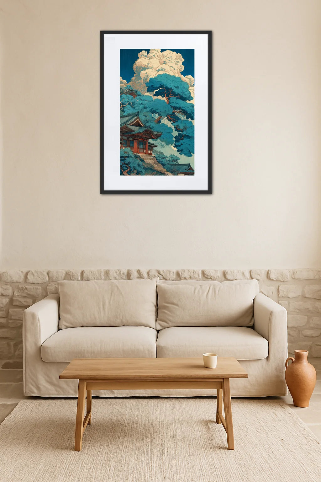 Cette œuvre exprime la rencontre délicate entre la nature et la culture japonaise, où chaque élément semble chargé d’une symbolique qui transcende le temps. L’arbre, majestueux et imposant, déploie ses branches avec une force tranquille, évoquant la persistance de la vie face aux éléments. Le temple niché entre les feuillages incarne le refuge spirituel, ce lieu sacré où le regard se perd dans l’immensité du ciel. Le contraste entre l’architecture soignée et la nature luxuriante met en lumière la quête d’équilibre propre à l’esthétique japonaise. Les nuages, denses et mouvants, ajoutent une dimension onirique à ce tableau, suggérant que la beauté réside aussi dans l’éphémère et l’inattendu. L’intensité des formes et des volumes invite à une immersion profonde, presque méditative, où l’observateur peut ressentir la puissance d’un instant suspendu. Ce tableau devient alors un pont entre le visible et l’invisible, un hommage à la délicatesse et à la force de la nature, sublimée par une culture millénaire qui célèbre la simplicité et la profondeur.