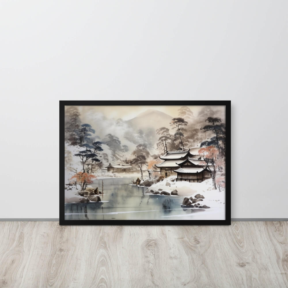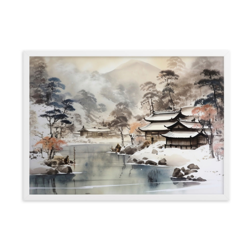 Découvrez la beauté paisible de l'hiver japonais avec ce tableau représentant un paysage enneigé. Les nuances de blanc et de bleu évoquent la sérénité et la pureté de la neige qui recouvre les montagnes, les arbres et les toits des maisons nippones.