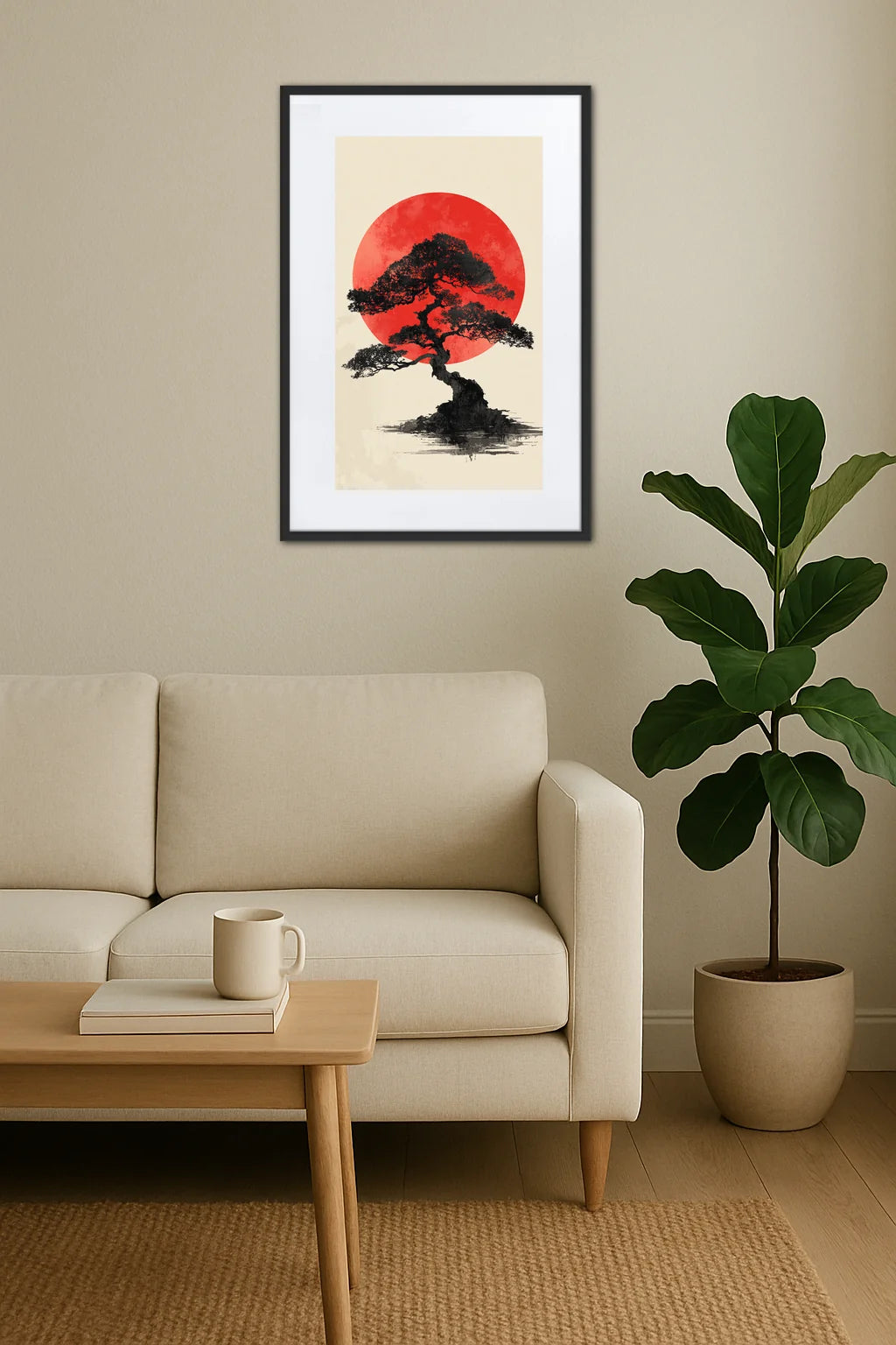- Contraste visuel saisissant : Le rouge éclatant du cercle solaire attire immédiatement le regard et crée une dynamique puissante avec le noir profond du bonsaï. Cette opposition donne à la pièce une force singulière qui anime l’espace où elle est posée. Elle stimule l’émotion en réveillant l’intensité d’un coucher de soleil vibrant d’énergie et de mystère.