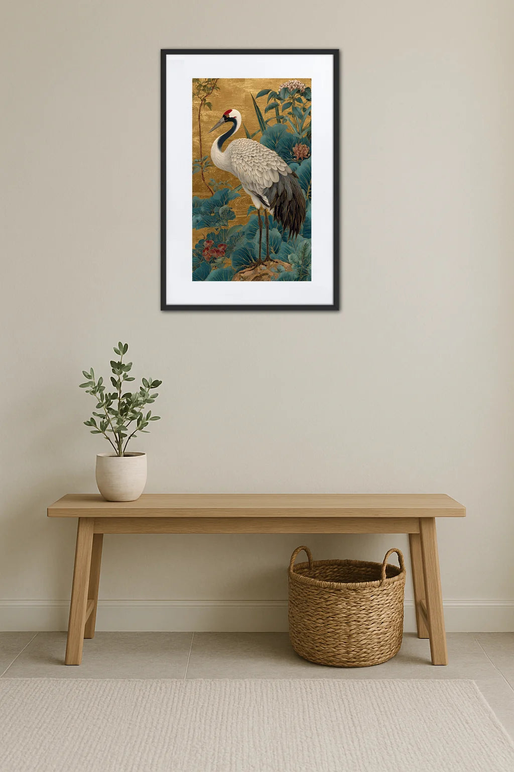 Ce tableau japonais oiseau évoque bien plus qu’une simple représentation : il incarne un lien profond entre la culture nippone et la nature qui l’inspire. La grue, souvent présente dans l’imaginaire japonais, symbolise la longévité, la fidélité et la paix intérieure. Ici, elle se pose avec une dignité naturelle sur un fond doré, rappelant les paravents anciens et les estampes précieuses qui ont traversé les siècles. Les végétaux qui l’entourent, aux contours délicats et aux formes généreuses, évoquent la luxuriance discrète des jardins japonais, où chaque élément est pensé pour créer un équilibre subtil. Ce tableau fait dialoguer le regardeur avec un univers empreint de calme et de mystère, où la présence de l’oiseau devient une invitation à la contemplation et à la rêverie. La richesse des détails et la profondeur des contrastes racontent une histoire ancienne, celle d’un art qui célèbre la beauté dans sa forme la plus pure, tout en laissant une place à l’interprétation personnelle. L’œuvre devient ainsi un pont entre le passé et le présent, une fenêtre ouverte sur l’âme d’un pays où chaque image est une poésie visuelle.