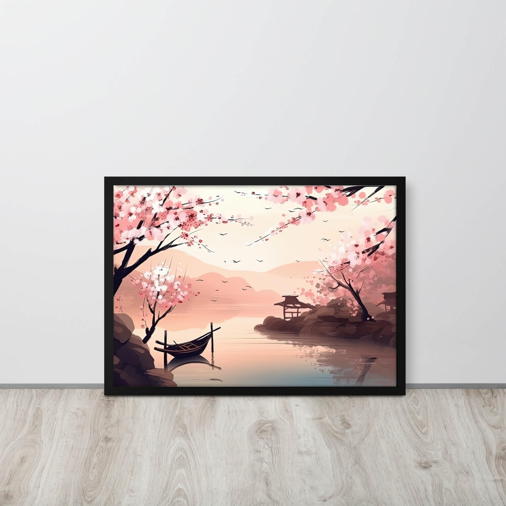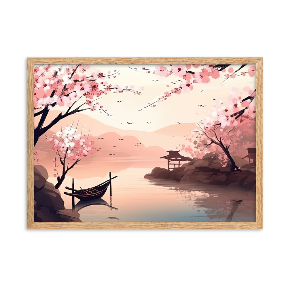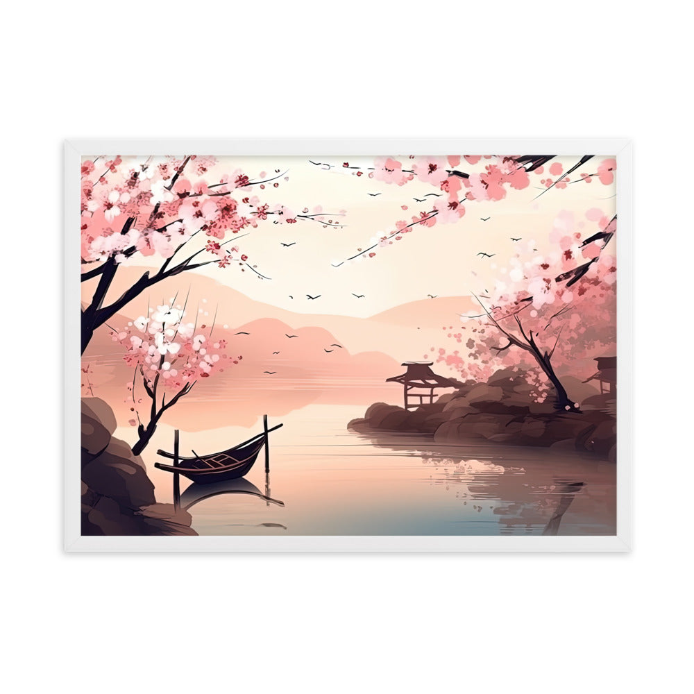 Ce tableau japonais vous invite à vous plonger dans un paysage naturel paisible, où un fleuve sinueux serpente à travers un verger de cerisiers en fleurs. L'illustration détaillée et la palette de couleurs douces évoquent une ambiance harmonieuse et relaxante.