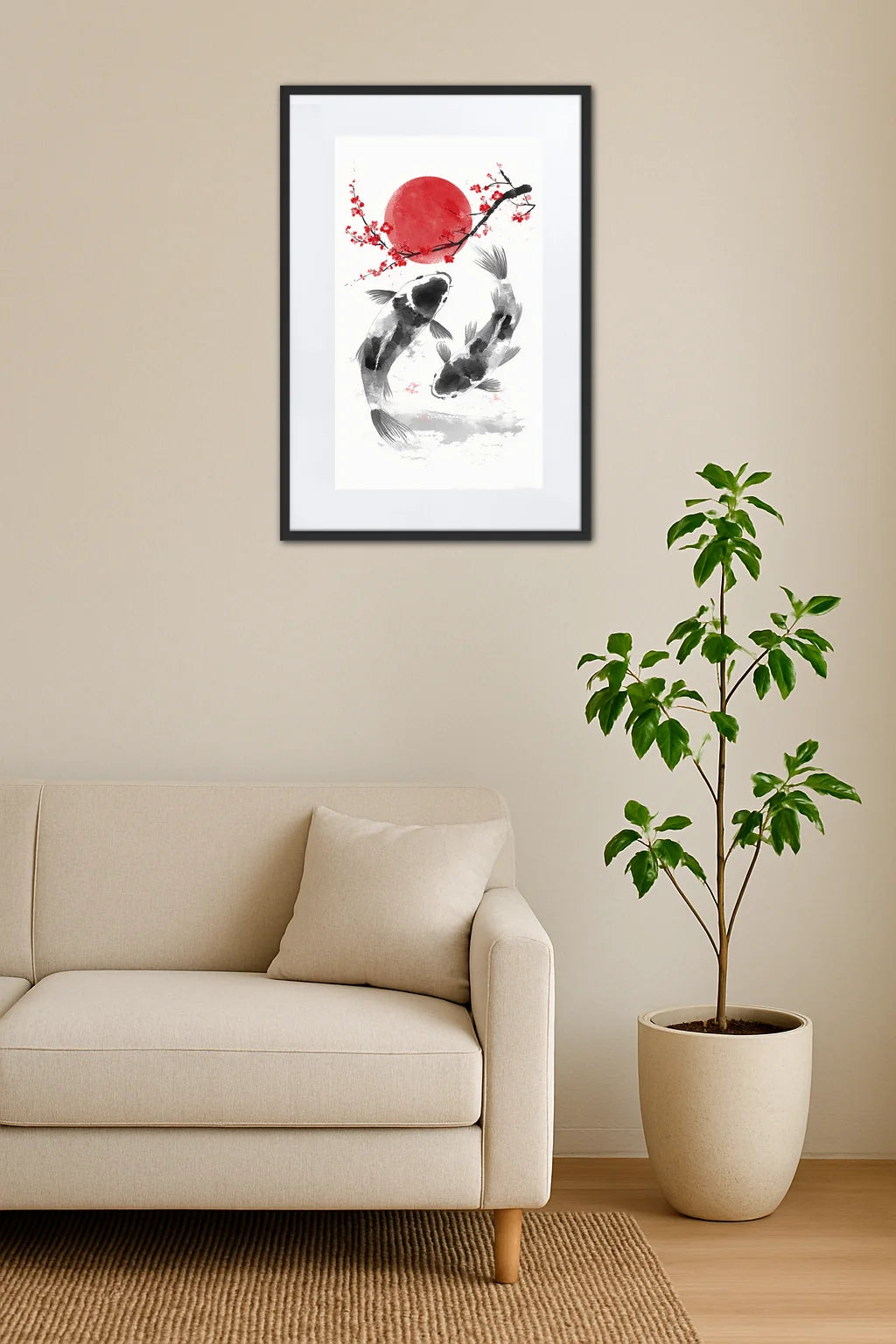 Ce tableau, inspiré de l’esthétique raffinée de l’art nippon, raconte une histoire où la nature, le symbolisme et la philosophie se rencontrent. Le soleil rouge, symbole puissant du Japon, éclaire de sa présence chaleureuse une scène où deux carpes nagent en parfaite symbiose, rappelant la persévérance et la chance selon la tradition. La branche fleurie de cerisier, subtile et délicate, apporte une note de vie éphémère, soulignant la beauté fugace du moment présent. L’ensemble, par la simplicité apparente de ses formes et la fluidité de ses traits, évoque une méditation sur le cycle de la vie et l’harmonie des contraires. Ce tableau ne se contente pas d’habiller un mur : il invite à ressentir l’équilibre entre énergie et calme, tradition et modernité, nature et culture. Il devient ainsi un pont entre l’Orient et l’âme contemporaine, une fenêtre ouverte sur un univers où chaque regard découvre de nouvelles nuances d’émotion et de sens.