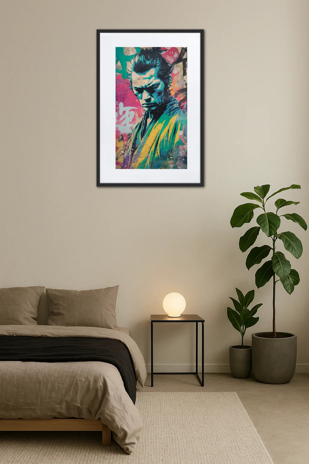 Cette œuvre est une rencontre saisissante entre l’âme ancestrale du Japon et l’énergie bouillonnante du street art contemporain. Le personnage, silhouette emblématique d’un samouraï ou d’un voyageur intérieur, semble figé dans une réflexion profonde, tandis que les éclats de couleurs jaillissent autour de lui comme le tumulte d’une ville en perpétuel mouvement. L’expression sur son visage évoque autant la discipline que le poids des traditions, contrastant avec le décor éclaté et les formes abstraites qui rappellent les fresques urbaines. Chaque détail, chaque trait, raconte une histoire de dualité entre la sérénité méditative et la pulsation du monde moderne, où l’ancien dialogue avec le nouveau à travers un langage visuel inédit. Le choix des teintes vives et des formes décalées traduit cette tension palpable entre calme intérieur et effervescence extérieure, offrant au regard un spectacle à la fois familier et étrangement perturbant. Cette composition, vibrante et pleine de vie, invite à contempler non seulement l’œuvre mais aussi les émotions et réflexions qu’elle suscite, inscrivant le street art japonais dans une dimension presque poétique et intemporelle.