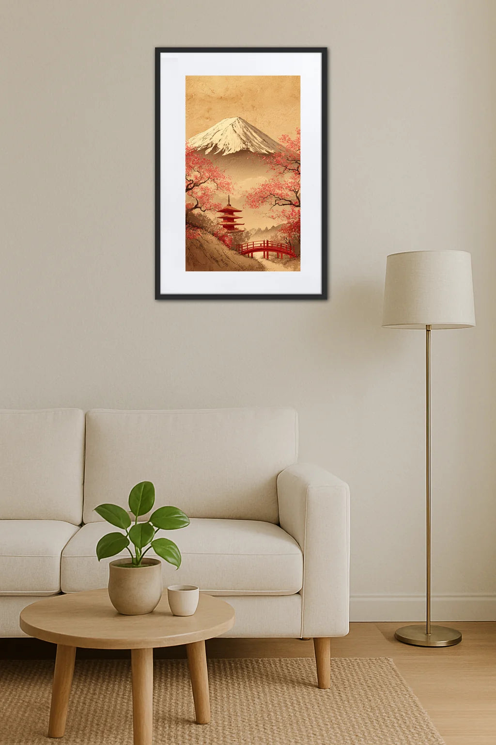 Ce tableau incarne une vision poétique et intemporelle du Japon traditionnel, où la nature et l'architecture se fondent avec grâce. Le Mont Fuji, symbole de force et de spiritualité, domine l'horizon dans une palette chaleureuse qui évoque l'aube naissante. Autour, les branches délicates des cerisiers en fleur dessinent des arabesques, témoignant de la beauté éphémère des saisons et de l'art subtil du cycle de la vie. La pagode rouge, au charme discret mais puissant, invite à la contemplation et au recueillement, symbolisant l'équilibre entre l'homme et son environnement. Ce paysage, à la fois simple et profond, transmet une sensation d'apaisement et de mystère, comme une promesse d'évasion intérieure. Chaque coup de pinceau révèle la finesse d'une tradition artistique millénaire, où la nature est célébrée dans son essence la plus pure. L’œuvre dialogue avec l'âme du spectateur, l'engageant dans une expérience sensible qui dépasse le temps et les frontières, tout en honorant la richesse culturelle et spirituelle du Japon.