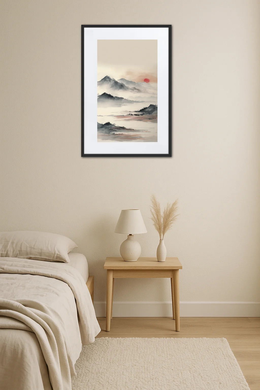 Ce tableau japonais zen évoque un voyage intérieur au cœur des paysages emblématiques du Japon, où la montagne s’élève majestueusement au-dessus des nappes de brume. L’œuvre se déploie comme une poésie visuelle, mêlant la douceur des teintes naturelles à la force tranquille des formes. Le soleil rouge, discret mais puissant, rappelle le symbole national tout en insufflant une chaleur apaisante à l’ensemble. Chaque couche de montagnes, dessinée avec délicatesse, semble flotter dans un espace intemporel, suspendu entre ciel et terre. Cette composition invite à ralentir, à sentir le souffle du vent et à écouter le chant silencieux de la nature. Le tableau incarne l’esprit zen, où la simplicité devient source de profondeur et où le vide révèle autant que le plein. Il invite à un moment de méditation, à une pause où l’on se reconnecte à soi-même et à la beauté éphémère de l’instant. Plus qu’une représentation, c’est une expérience sensorielle et culturelle, un dialogue entre l’art et l’âme qui transcende les frontières et les époques.