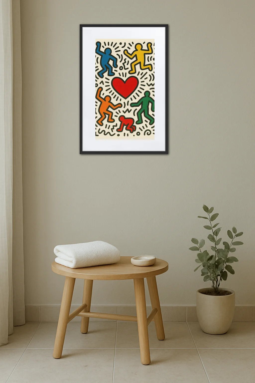 Ce tableau Keith Haring Pop Art incarne l’essence même d’une époque où l’art se libérait des conventions pour devenir un langage universel. Les figures stylisées, presque enfantines, évoluent avec une vitalité contagieuse, portées par des couleurs franches et des contours nets qui évoquent une simplicité pleine de force. Chaque silhouette semble en mouvement, vibrant d’une intensité qui transcende la toile, tandis que le cœur central symbolise un lien universel d’amour et de solidarité. Au-delà de sa gaieté apparente, cette œuvre raconte aussi une histoire de résistance et d’espoir, reflet d’un artiste qui a su capter les battements de la rue, ses luttes et ses joies. Le rythme effervescent des formes et des lignes qui rayonnent autour des personnages invite à une lecture aussi bien émotionnelle que culturelle, où la liberté d’expression trouve son cri le plus vibrant. Ce tableau n’est pas qu’un simple décor, il est une célébration de la vie, une ode à la connexion humaine et au pouvoir de l’art comme vecteur de changement et d’émotion profonde.