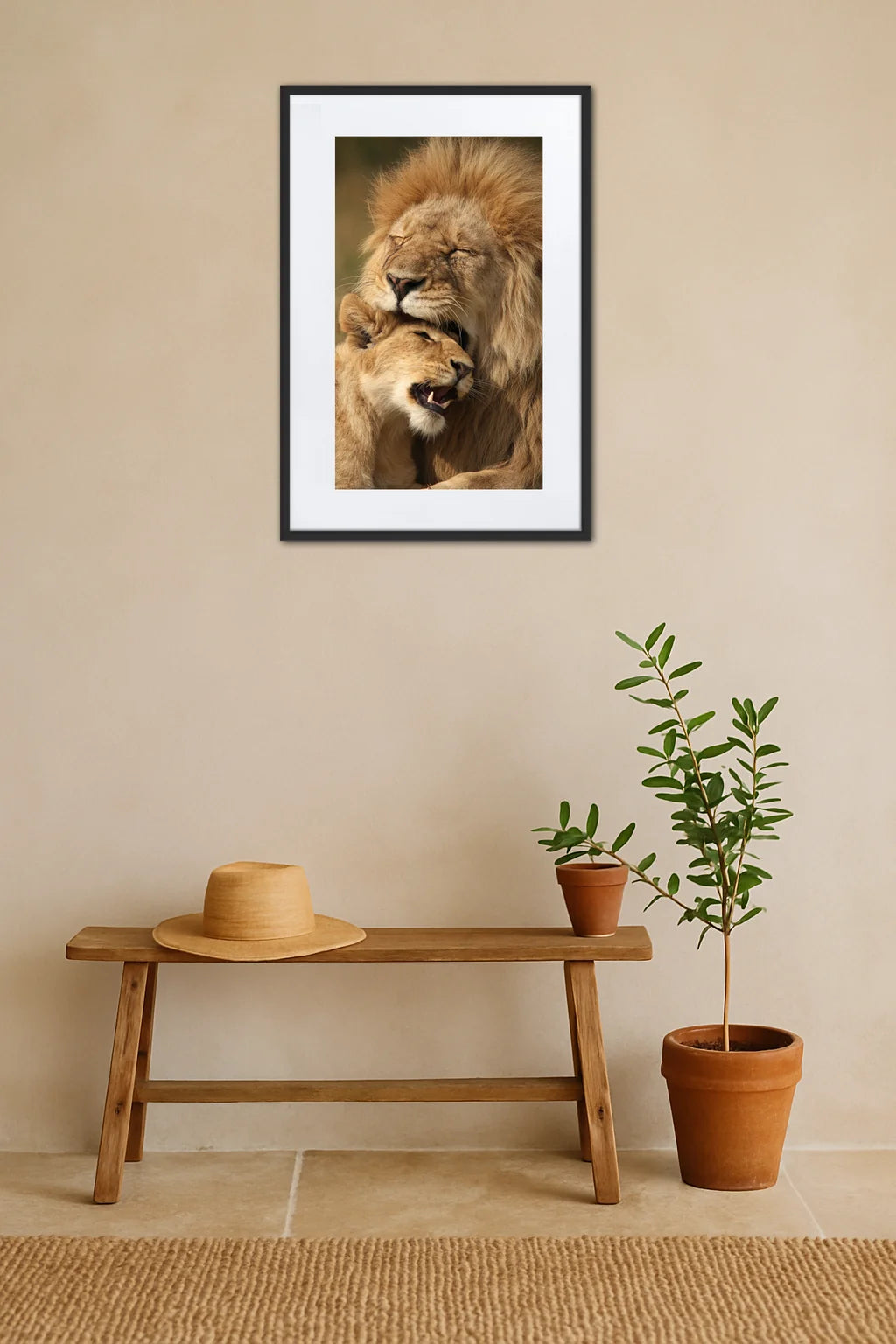 - Intensité visuelle : Le contraste entre le lion adulte et son lionceau attire le regard, éveillant une émotion sincère. Cette composition crée une vibration qui transcende l’image pour toucher l’âme, apportant une présence vivante à votre espace.