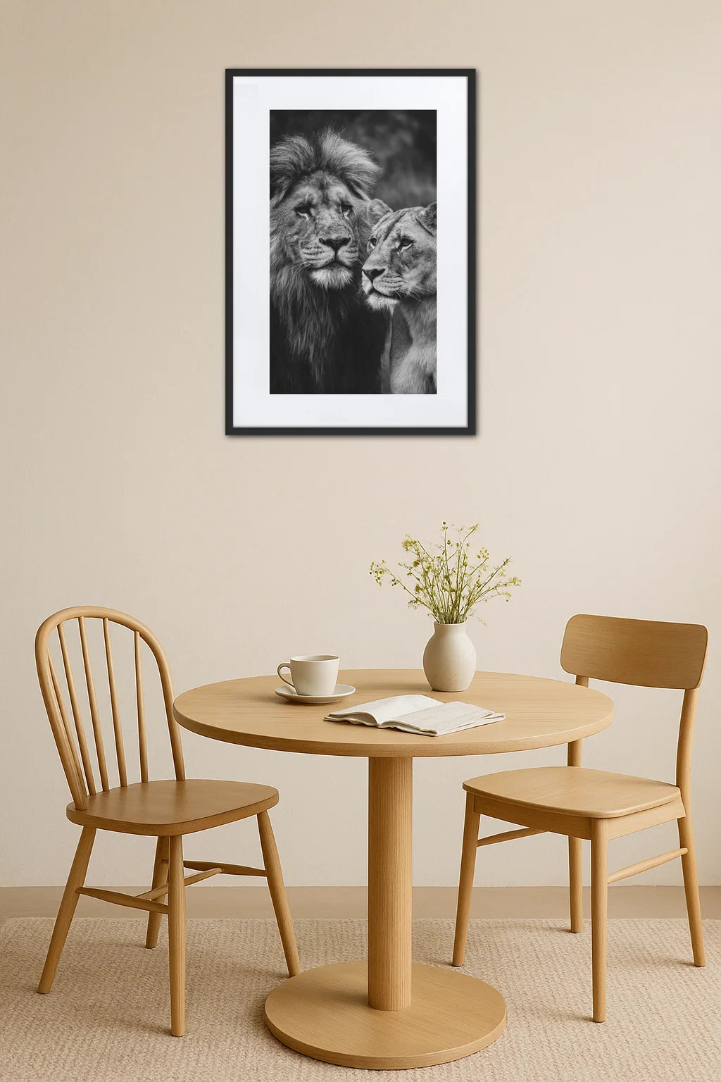 Ce tableau saisit un moment suspendu entre deux êtres emblématiques de la nature, le lion et la lionne, dans une mise en scène où chaque détail raconte une histoire. Le choix du noir et blanc transcende la simple représentation pour révéler la dualité entre la puissance brute et la douceur contenue, entre la majesté et la complicité. Ici, le contraste ne se limite pas aux nuances mais s'étend à l'intensité émotionnelle qui émane du regard des deux félins. Cette œuvre invite à réfléchir sur l'équilibre fragile qui règne dans le monde animal mais aussi en chacun de nous, où se mêlent force, protection et vulnérabilité. L'image évoque aussi la culture africaine, terre originelle des lions, où ces animaux sont souvent perçus comme des symboles royaux et spirituels. Le cadre épuré et la composition rigoureuse renforcent l'impression d'une scène intemporelle, presque sacrée, qui ne cesse d'inspirer l'admiration et le respect. En accueillant ce tableau, on ouvre une fenêtre sur un univers où la nature danse avec l'art, où chaque regard devient une invitation à la rêverie et à la découverte intérieure.