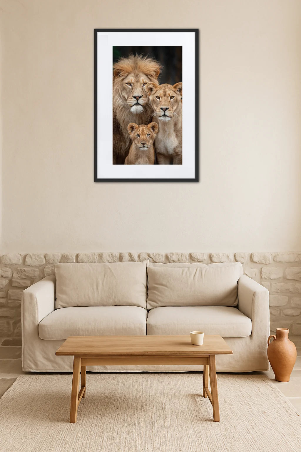 Ce tableau transcende la simple représentation d’une famille de lions pour devenir une véritable ode à la vie sauvage et à ses dynamiques profondes. Le lion, symbole universel de courage et de royauté, se tient aux côtés de la lionne, figure de protection et de sagesse, tandis que le lionceau incarne l’innocence et l’espoir. Ensemble, ils forment un trio harmonieux où chaque regard révèle un fragment d’histoire, une émotion partagée. La composition, empreinte d’une intensité silencieuse, joue avec la lumière naturelle et les contrastes, capturant la texture vibrante des fourrures et la profondeur des yeux. C’est une invitation à contempler la nature dans toute sa complexité, entre force brute et délicatesse. Plus qu’une image, ce tableau est une rencontre avec l’âme du règne animal, un rappel de la beauté fragile et puissante qui habite chaque être vivant. Il évoque aussi une réflexion sur les liens familiaux, la protection instinctive et l’héritage transmis de génération en génération. Ici, la nature s’exprime avec une élégance intemporelle, offrant à celui qui le contemple un instant suspendu, chargé de sens et d’émotions.