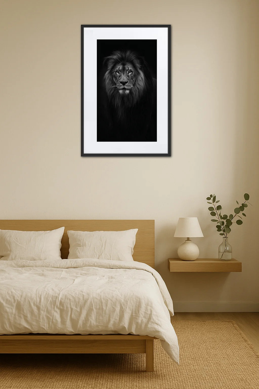 Ce tableau noir et blanc transcende la simple représentation pour devenir une ode à la majesté intemporelle du roi de la savane. L'artiste, par un jeu subtil de clair-obscur, invite à plonger dans l'âme du lion, révélant non seulement sa puissance mais aussi sa profondeur émotionnelle. L'ombre enveloppante, loin d'effacer les détails, les magnifie et offre une présence presque palpable, comme si l'animal s'apprêtait à surgir hors du cadre. Cette œuvre saisit l'équilibre délicat entre la beauté brute et la sagesse silencieuse, inscrivant le lion dans une dimension presque mythique. Elle célèbre également le lien universel entre l'homme et la nature, cette fascination ancestrale pour un animal qui incarne courage, fierté et autorité. En contemplant ce tableau, on ressent l'appel à retrouver cette force intérieure, ce souffle de vie qui habite chacun. Plus qu'un simple décor, il devient un symbole vibrant, une source d'inspiration pour quiconque cherche à affirmer sa puissance avec élégance et retenue. L'intensité des regards, la douceur des poils, tout concourt à créer un instant suspendu, empreint de respect et d'admiration.