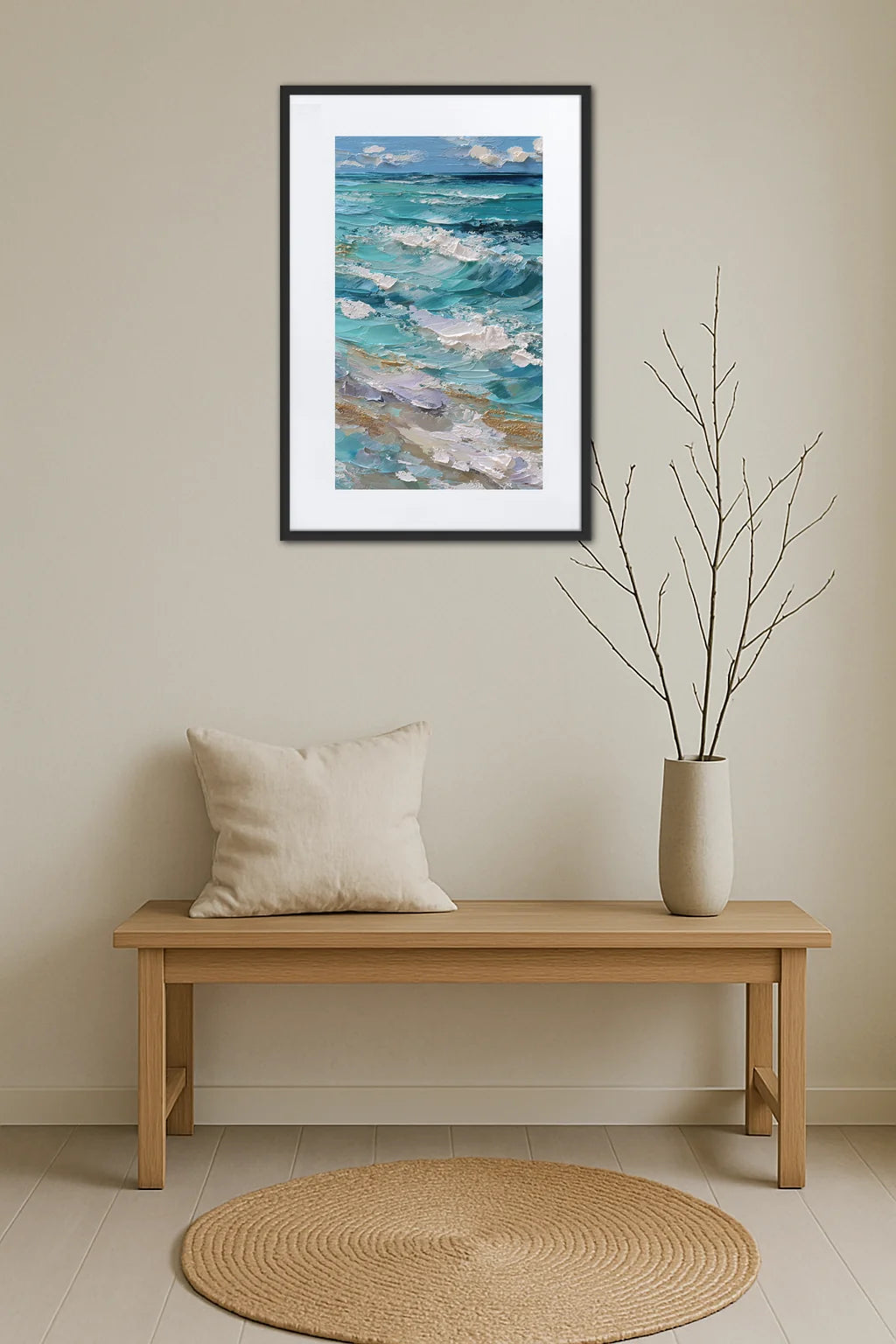 - Palette marine : Les nuances de bleu, turquoise et blanc s'entrelacent pour évoquer la pureté et la fraîcheur de l'océan, tandis que les touches subtiles de sable suggèrent la douceur du rivage. Cette harmonie chromatique apaise l'esprit tout en faisant vibrer le cœur de l'amoureux de la mer.