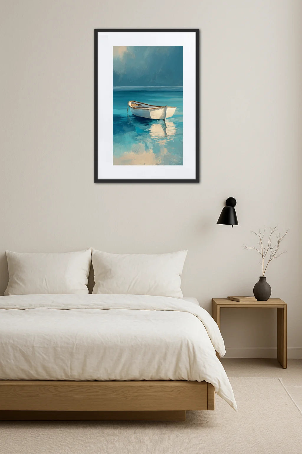 - Une composition équilibrée : le bateau, centré avec délicatesse, crée une harmonie visuelle qui rassure et apaise. Cette stabilité formelle reflète un équilibre intérieur, invitant à la contemplation et à une pause méditative dans le tumulte du quotidien.