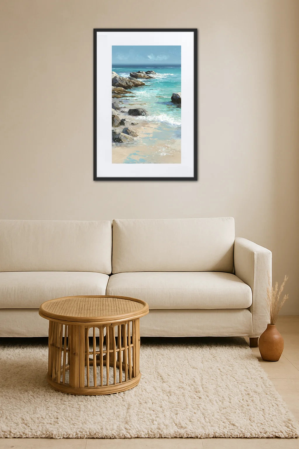 Ce tableau évoque une rencontre privilégiée entre la force immuable des rochers et la fluidité changeante de la mer, un contraste puissant qui parle à l’âme. Il raconte l’histoire d’un lieu où chaque vague vient effleurer la pierre, un instant suspendu entre mouvement et stabilité. Plus qu’un simple paysage, cette œuvre célèbre la poésie des éléments naturels, où la lumière joue avec les formes pour créer une harmonie presque palpable. On sent dans la texture des rochers la robustesse du temps, tandis que la mer dévoile ses nuances profondes, mêlant turquoise et azur dans un éclat vibrant. C’est un hommage à la beauté brute et authentique du littoral, un espace de méditation où l’esprit peut se perdre et se retrouver. La mer, avec sa présence infinie, invite à un voyage intérieur, tandis que les rochers, témoins silencieux, gardent les secrets d’un monde ancien. Par cette composition, l’artiste offre une fenêtre ouverte sur l’immensité, une invitation à ressentir la puissance tranquille de la nature, à écouter le murmure des flots et à se laisser bercer par leur rythme apaisant. Cette œuvre est une ode à la rencontre entre la pérennité et l’éphémère, un tableau qui sublime l’énergie et la sérénité du bord de mer.