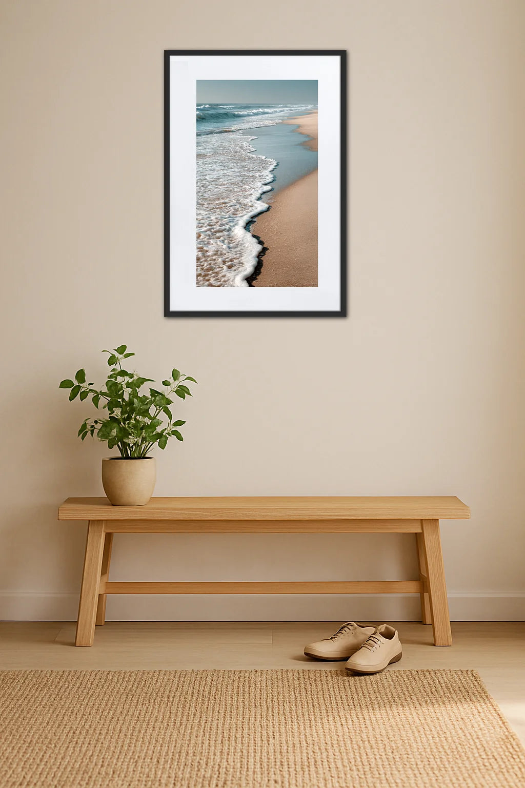 - Une palette naturelle et équilibrée : Les teintes profondes de l'eau dialoguent avec les nuances chaudes du rivage, offrant un équilibre harmonieux qui calme l’esprit. Ce mélange subtil évoque la tranquillité des instants passés au bord de la mer, où chaque regard se fait refuge.