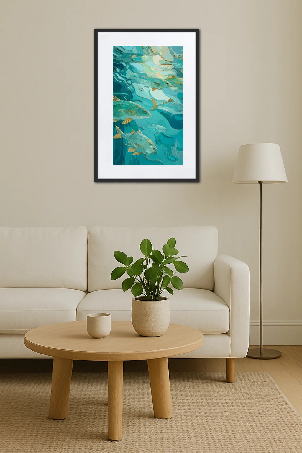 - Éclat des nuances : Les couleurs vibrantes de l’eau mêlées aux touches dorées des poissons créent un spectacle visuel qui attire le regard avec délicatesse. Cette richesse visuelle transporte l’âme dans un univers marin apaisant, éveillant un sentiment de sérénité profonde et d’émerveillement.