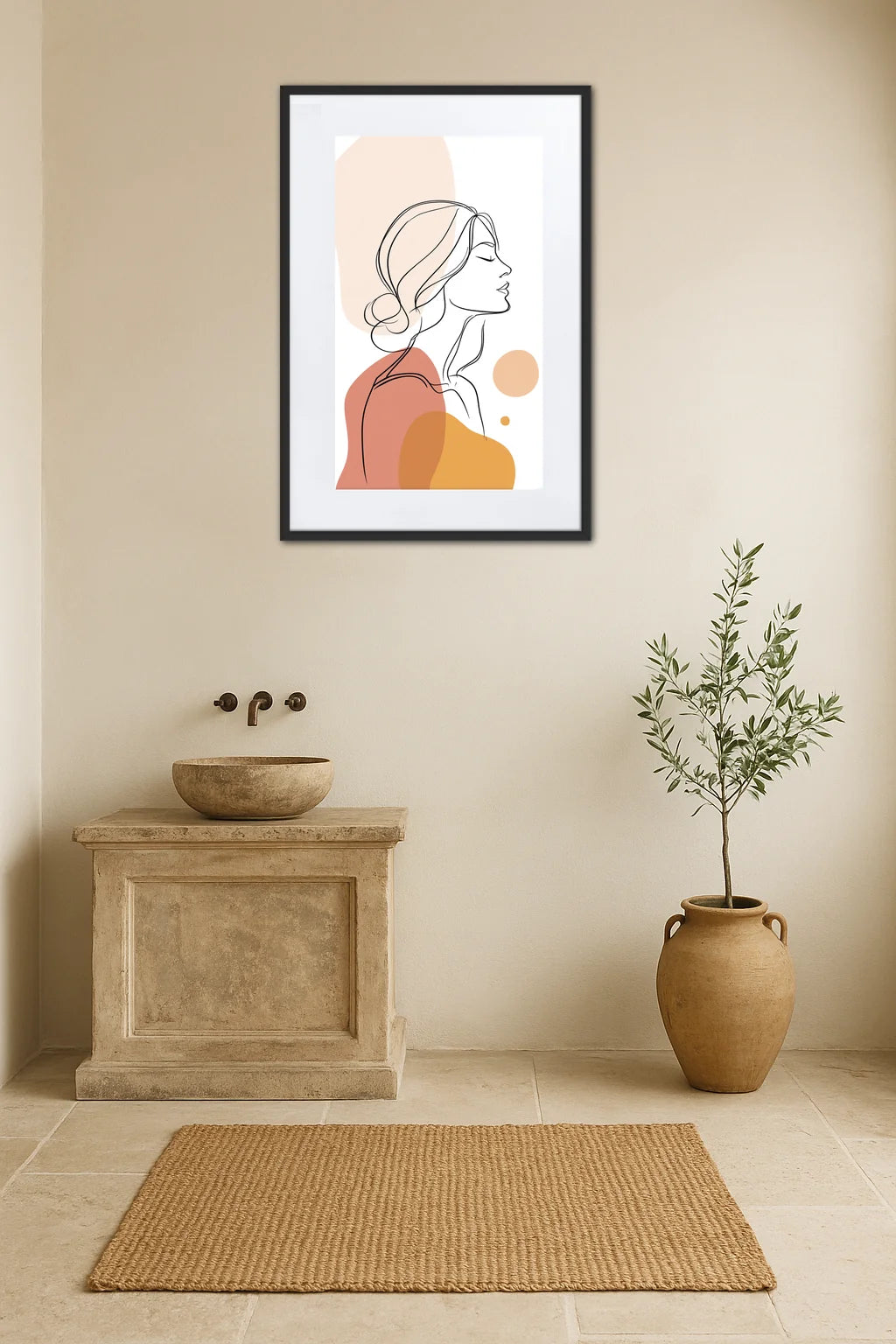 Ce tableau minimaliste femme incarne une quête de pureté et d’essence à travers une représentation épurée et fluide. La silhouette féminine, dessinée d’un trait continu et léger, évoque une élégance intemporelle et une force intérieure calme. Sans fioritures, le visage, tourné de profil, exprime une sérénité presque méditative, un moment suspendu entre rêve et réalité. Les formes organiques qui l'accompagnent, aux teintes chaleureuses, tracent un dialogue subtil entre la douceur des courbes et la précision du trait. Cette œuvre se déploie dans un espace blanc, comme une respiration, un souffle où le regard trouve refuge. Elle s’inscrit dans une tradition contemporaine où l’art se veut à la fois accessible et profond, où la simplicité devient un langage à part entière. Le tableau évoque ainsi la modernité d’une féminité assumée, loin des clichés, une figure qui invite à la réflexion sur la beauté des choses essentielles, celles que l’on ressent plus qu’on ne voit. C’est un hommage à l’équilibre entre la force et la délicatesse, une ode à la présence douce et affirmée, qui résonne avec une sensibilité contemporaine empreinte de poésie.