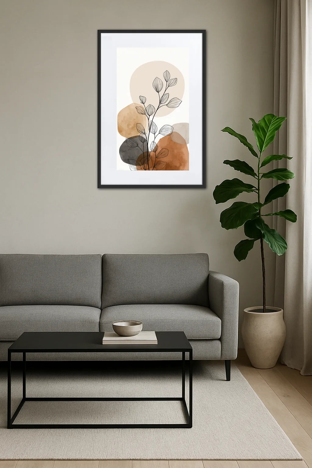 Ce tableau minimaliste marron s’inscrit dans une quête subtile d’harmonie entre nature et abstraction. Les formes organiques, doucement esquissées, évoquent la fragilité et la beauté éphémère des feuilles suspendues dans un souffle léger. Les teintes chaudes, déclinées dans une palette qui va du brun chaleureux à l’ocre profond, dessinent un paysage intérieur où chaque nuance raconte une émotion. Ce jeu de transparence et de superposition crée un rythme visuel apaisant, presque méditatif, qui invite à la rêverie. À travers cette œuvre, c’est un dialogue entre simplicité et profondeur qui se tisse, comme une danse entre lumière et ombre, entre forme et vide. Le trait noir, fin et précis, souligne sans alourdir, conférant à la composition une élégance naturelle. L’ensemble dégage une atmosphère raffinée, inspirée des grands courants du design contemporain et de la poésie visuelle, où l’essentiel se révèle dans l’épure. Ce tableau transcende ainsi le décor pour devenir une respiration artistique, un espace où l’âme peut se poser et se laisser bercer par la délicatesse des instants suspendus.