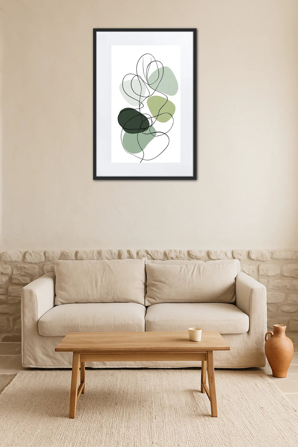 Ce Tableau Minimaliste Vert est bien plus qu’une simple composition graphique, il est une invitation à la contemplation d’un monde où simplicité rime avec profondeur. Les formes arrondies et les nuances variées de vert évoquent la richesse d’un paysage naturel réinterprété avec subtilité. Le fil noir qui serpente à travers l’œuvre rappelle le tracé d’une pensée fluide, libre, presque méditative, contrastant avec la douceur des aplats colorés. Dans cette alliance, l’artiste traduit une sensation d’apaisement, comme si chaque élément cherchait à recréer une respiration intérieure, un souffle tranquille dans le tumulte quotidien. L’œuvre puise aussi dans une tradition moderne où l’essentiel se dévoile par l’épure, où le silence des formes invite à un dialogue intérieur. Le choix de verts variés, allant du doux sauge au vert profond, évoque la force tranquille de la nature, ses multiples nuances et ses cycles immuables. En cela, ce tableau est un pont entre une expression contemporaine et une mémoire ancestrale, un hommage à la beauté discrète et aux rythmes lents qui apaisent l’âme.