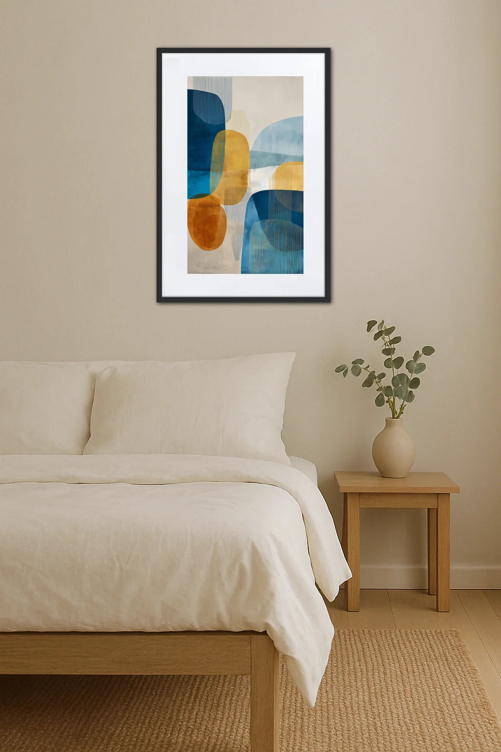 Ce tableau moderne bleu et jaune est une célébration des contrastes maîtrisés, où le bleu profond évoque la sérénité des océans tandis que le jaune éclatant insuffle une vitalité solaire. Dans cette composition, les formes organiques s'entrelacent avec fluidité, suggérant un paysage intérieur fait de souvenirs et d'émotions capturées dans une abstraction délicate. La superposition des teintes crée un rythme visuel, presque musical, qui invite à la rêverie et à la réflexion. L'œuvre explore la tension entre lumière et ombre, entre présence et transparence, offrant une expérience sensorielle riche et nuancée. Elle incarne une modernité intemporelle, où la couleur devient langage et le tableau un espace d'échange entre l'artiste et l'observateur. Chaque élément semble dialoguer avec le suivant, comme une conversation silencieuse qui révèle peu à peu ses secrets. En s'immergeant dans cette composition, on ressent une connexion profonde avec une esthétique raffinée, à la croisée des mondes concrets et imaginaires, où la beauté naît de la simplicité et de la subtilité des formes.