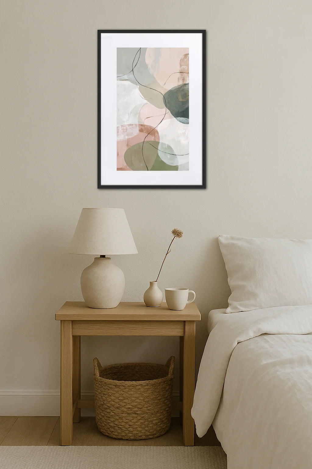 Ce tableau moderne pour chambre puise son inspiration dans le langage des formes organiques et des lignes fluides, évoquant une danse silencieuse d'ombres et de lumières. À travers ses aplats doux et ses contours légers, l'œuvre propose un voyage apaisant où le regard se perd dans une succession de volumes délicats, presque palpables. Chaque forme semble flotter avec légèreté, rappelant les paysages brumeux d’un matin calme ou les reflets tamisés d’une lumière filtrée. La palette choisie, subtile et raffinée, dialogue avec l’espace pour instaurer une atmosphère sereine et enveloppante, idéale pour un lieu de repos. Cette œuvre ne se contente pas de décorer, elle invite à la contemplation et à la méditation, offrant un refuge visuel où l’esprit peut se ressourcer. Loin de toute agitation, elle incarne l’équilibre parfait entre modernité et douceur, un trait d’union entre l’art contemporain et le monde sensible. Ce tableau est une ode à la délicatesse et à la poésie des formes, un témoignage vibrant d’une esthétique pensée pour sublimer le cocon intime de votre chambre.