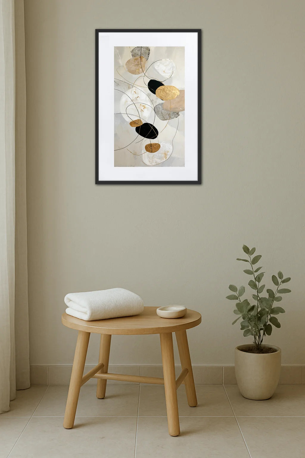 Dans cet univers où la simplicité rencontre la sophistication, chaque élément semble flotter en parfaite osmose. Les formes arrondies, presque évanescentes, dialoguent avec des touches d’or qui capturent l’éclat d’un instant suspendu. Le contraste subtil entre les zones claires et foncées évoque une danse silencieuse, où la lumière joue avec l’ombre pour créer un récit poétique. Cette œuvre ne se contente pas de décorer un espace, elle invite à une immersion sensorielle, une pause contemplative où l’esprit peut vagabonder librement. Elle puise son inspiration dans les mouvements artistiques contemporains qui valorisent la pureté des lignes et la richesse des textures, réinterprétant la tradition avec une modernité élégante. Plus qu’un simple tableau, c’est une fenêtre ouverte sur un monde fait de douceur et de raffinement, où chaque regard découvre une nouvelle nuance, un détail insoupçonné, une émotion profonde. La composition, à la fois aérienne et structurée, reflète ce jeu d’équilibre entre le tangible et l’éphémère, entre la maîtrise technique et la liberté expressive. Cette œuvre s’adresse à ceux qui cherchent à envelopper leur intérieur d’une atmosphère sereine, où l’art devient une source d’inspiration et de bien-être.