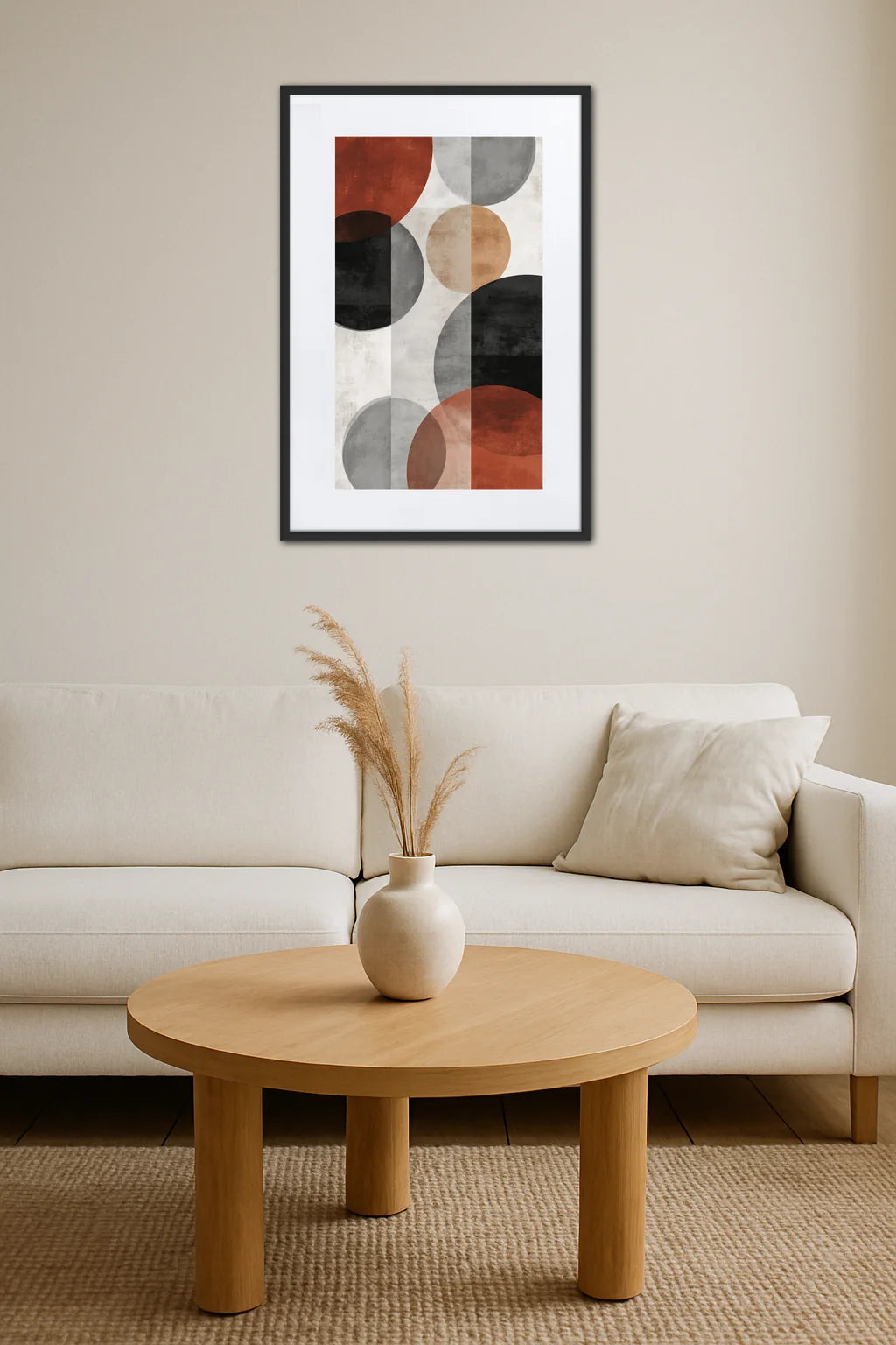 Cette œuvre incarne une exploration délicate des volumes simples, réinventés avec une touche de sophistication. Les cercles, disposés avec soin, dialoguent entre eux dans un espace où les contrastes ne sont jamais brutaux mais toujours nuancés. Les teintes terreuses et noires croisent des tons plus doux, évoquant une rencontre entre la nature et la modernité urbaine. Plus qu'une simple composition, ce tableau invite à une méditation sur la coexistence des opposés, sur l'interaction entre ce qui est visible et ce qui se devine. Il rappelle les traditions artistiques tout en les réinterprétant avec audace, offrant une fenêtre ouverte sur l'univers des formes abstraites qui restent accessibles et chaleureuses. Ce tableau moderne design capte ainsi un instant suspendu où la rigueur géométrique se fait poétique, où l'art devient un langage universel capable de toucher l'âme. En accrochant cette pièce, on invite chez soi une vibration subtile, une atmosphère où chaque regard mène à une nouvelle découverte, à une émotion renouvelée, nourrie par le jeu des volumes et des teintes.