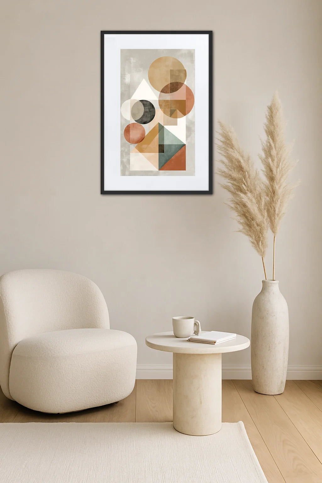 Ce tableau moderne aux formes géométriques est une invitation à la contemplation d’un monde où la simplicité des figures prend une dimension presque méditative. C’est comme si chaque cercle, chaque triangle, chaque carré racontait une histoire d’équilibre et de contraste, jouant sur la superposition et la transparence pour créer une profondeur inattendue. Les teintes naturelles, oscillant entre terre cuite, ocre et nuances douces de gris et d’ivoire, évoquent la délicatesse des paysages minéraux, tandis que la composition soigneusement pensée rappelle les principes d’une architecture intérieure harmonieuse. La force de cette œuvre réside dans sa capacité à mêler modernité et douceur, rigueur et délicatesse, invitant à une réflexion sur la manière dont les formes simples peuvent générer une émotion complexe. Au-delà de la décoration, ce tableau est un dialogue silencieux entre la géométrie et la sensibilité humaine, une résonance où chaque regard peut déceler une nouvelle nuance, une nouvelle histoire. Elle s’inscrit dans la tradition contemporaine qui valorise la pureté des lignes tout en insufflant une chaleur discrète, rendant hommage à la culture visuelle qui puise son inspiration dans les mouvements artistiques du XXe siècle tout en restant résolument actuelle.