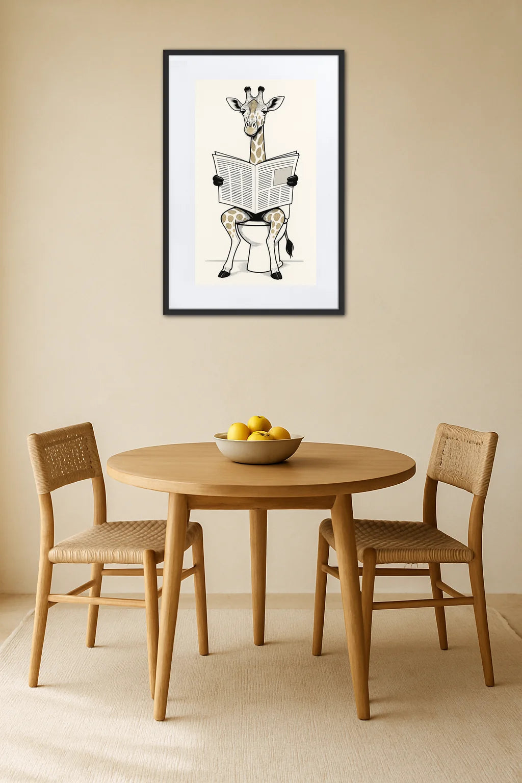 À travers cette œuvre, l’art moderne s’empare avec malice d’un instant quotidien, révélant la beauté cachée dans les gestes les plus simples. La girafe, majestueuse et tranquille, se dévoile ici dans une posture inattendue, assise sur un siège ordinaire et absorbée par la lecture d’un journal. Cette image, à la fois ludique et élégante, joue avec la surprise en détournant l’usage traditionnel de l’animal sauvage, tout en créant un dialogue entre le naturel et l’insolite. Les lignes épurées et les formes délicates soulignent la grâce de la scène, tandis que le choix d’un décor minimaliste laisse toute la place au personnage central, à la fois familier et étrange. Ce tableau dépasse la simple illustration pour devenir une réflexion sur l’espace personnel, le temps suspendu et la complicité silencieuse entre l’œuvre et celui qui l’observe. Une invitation à la rêverie, à l’émerveillement et à la légèreté, où chaque détail raconte une histoire, une émotion, un sourire à partager dans un lieu intime.