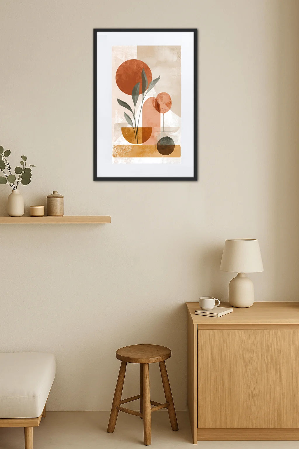 - Dialogue entre formes organiques et géométriques : La juxtaposition des silhouettes végétales et des volumes géométriques stimule la curiosité et invite à un voyage visuel. Cette rencontre entre abstraction et nature offre un équilibre stimulant qui éveille l’imagination. L’émotion suscitée est celle d’une découverte subtile, qui enrichit l’espace et le cœur.