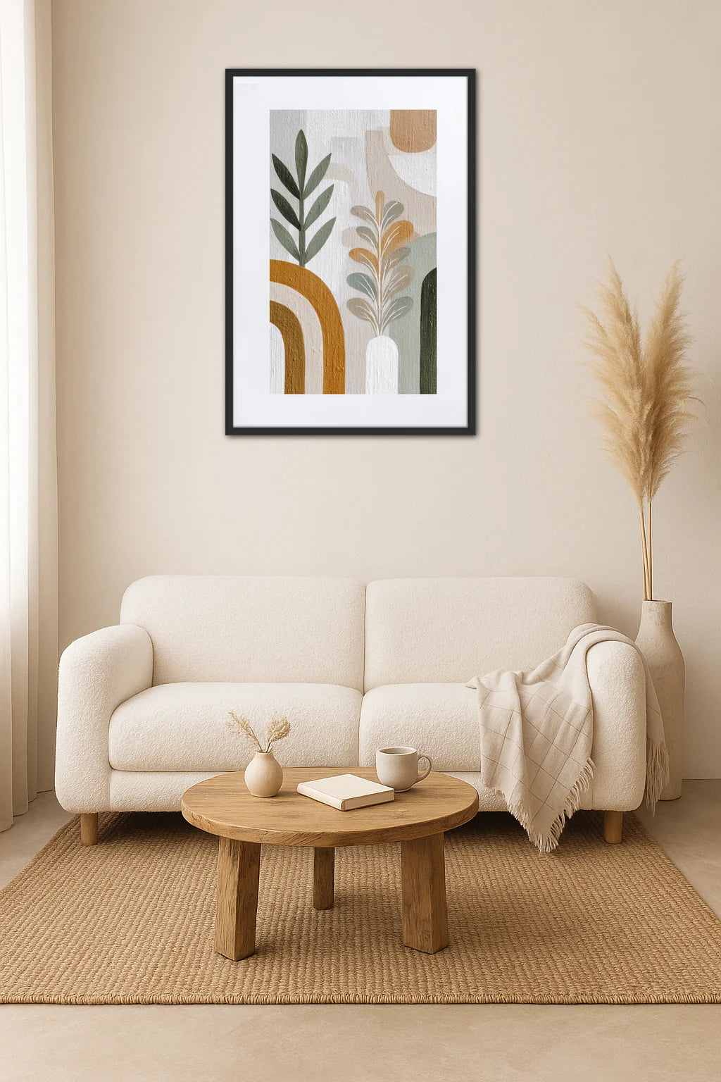 Ce tableau moderne scandinave puise son essence dans la beauté épurée des paysages nordiques, où la nature et la lumière jouent un rôle fondamental. Les formes arrondies et les silhouettes végétales sont délibérément stylisées, évoquant à la fois la sérénité d’un jardin secret et la modernité d’un design épuré. L’œuvre s’inscrit dans une tradition où l’équilibre visuel est primordial, chaque élément s’accordant pour composer une symphonie visuelle empreinte de douceur. La palette choisie, aux teintes naturelles et aux nuances terreuses, rappelle la lumière tamisée des longues journées scandinaves, offrant une sensation de calme et de renouveau. En mêlant abstraction et iconographie végétale, le tableau célèbre la rencontre entre l’art et la vie, suggérant un espace où l’esprit peut vagabonder librement et trouver un refuge. Ce dialogue entre formes simples et couleurs chaleureuses invite à une pause contemplative, un moment suspendu où se mêlent poésie et élégance, reflet d’un art qui sait se faire discret tout en captivant l’attention.