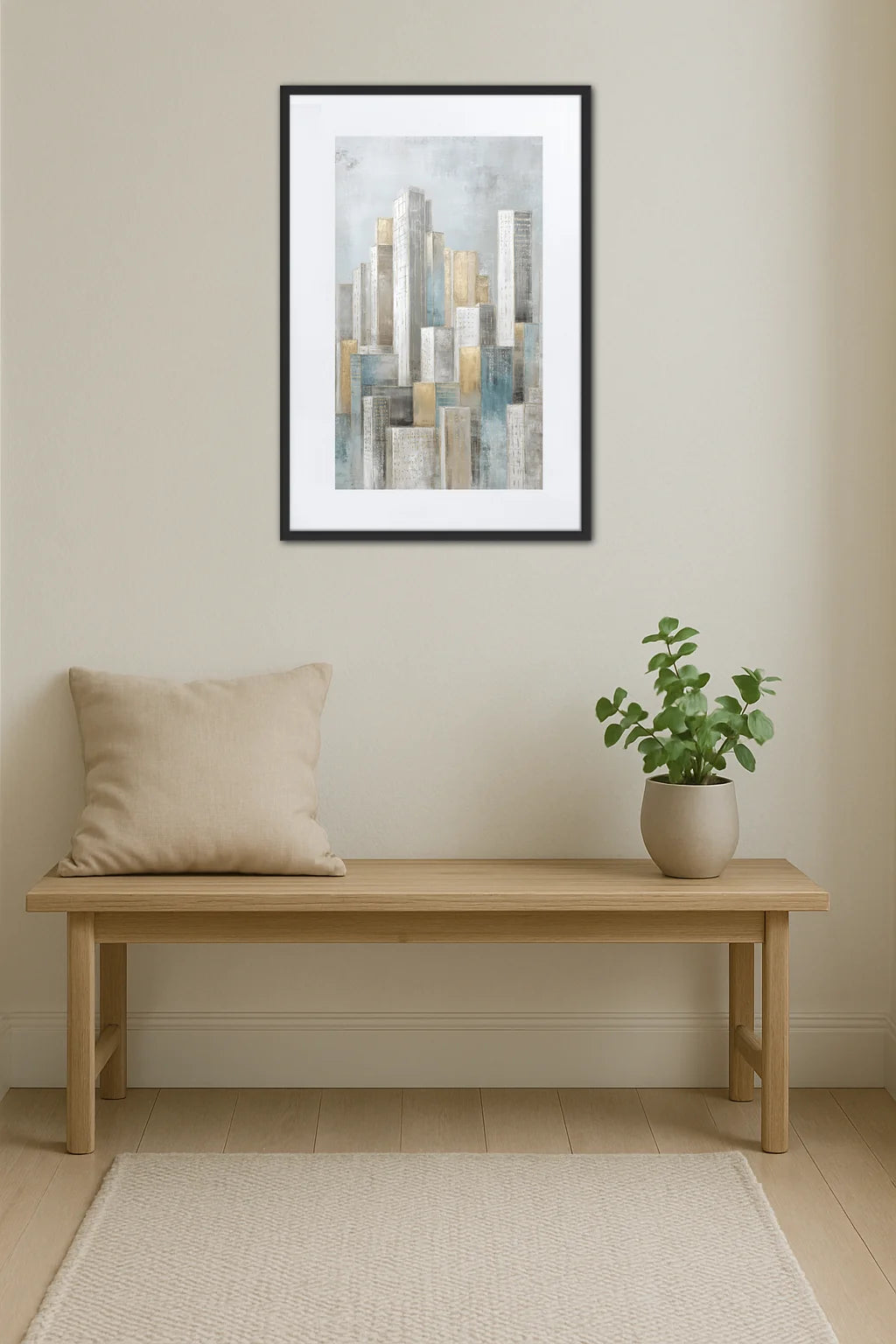 Cette œuvre incarne l'essence d'une ville à la fois familière et imaginaire, où les silhouettes des gratte-ciels se dressent dans un équilibre subtil entre verticalité imposante et douceur apaisante. Les nuances choisies témoignent d'une atmosphère suspendue, oscillant entre l'aube naissante et le crépuscule, évoquant le rythme incessant d'une cité en mouvement mais aussi ses instants de calme intérieur. Chaque édifice, aux contours légèrement estompés, invite à s'interroger sur la vie qui s'y déroule, sur les histoires humaines cachées derrière chaque fenêtre. Le tableau déploie ainsi une réflexion sur la coexistence entre modernité et sérénité, suggérant que la ville peut être un lieu d'inspiration profonde et de beauté délicate. L'artiste joue avec les formes géométriques, offrant une interprétation stylisée où la lumière semble caresser les façades, leur conférant une texture presque tactile. Cette composition poétique dialogue avec le spectateur en éveillant des sensations d'évasion, de nostalgie et d'admiration, tout en célébrant la richesse culturelle et la diversité que recèle tout paysage urbain. Plus qu'une simple représentation, c'est une invitation à redécouvrir la ville sous un regard neuf, empreint d'élégance et de douceur.