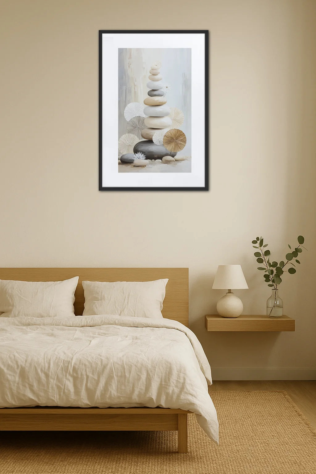 Cette œuvre incarne l’essence même de la quête d’équilibre qui habite l’esprit humain. Les pierres empilées, telles des sentinelles du temps, suggèrent la patience et la persévérance. Elles évoquent également la nature dans sa forme la plus pure, où chaque élément trouve sa juste place, ni trop lourd, ni trop léger, ni trop grand, ni trop petit. Autour d’elles, les motifs circulaires rappellent les cycles infinis de la vie et la douceur de la nature qui se renouvelle sans cesse. Le choix des teintes naturelles, proches de la terre et du sable, confère à ce tableau une atmosphère à la fois chaleureuse et apaisante, comme une brise légère caressant un paysage immobile. C’est une invitation à ralentir, à retrouver un souffle profond, à s’ancrer dans l’instant présent. Plus qu’une simple image, ce tableau est une poésie visuelle où l’âme se ressource, où la modernité dialogue avec la sagesse ancestrale. Il incite à l’harmonie intérieure, à la paix retrouvée dans la simplicité et la beauté des formes naturelles. Ce subtil équilibre entre rigueur et douceur, entre vide et pleine matière, fait de cette création un véritable refuge pour l’esprit en quête de sérénité.