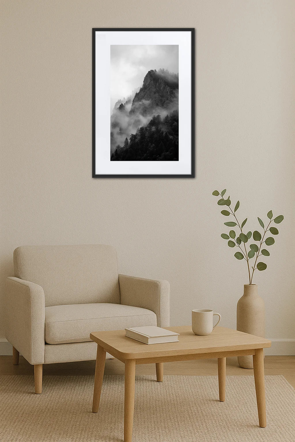 - Contrastes puissants : Le noir intense des roches et des arbres répond au gris léger de la brume avec un jeu de lumière subtil et élégant. Cette opposition crée une dynamique visuelle qui capte l’attention tout en inspirant la réflexion. L’émotion liée à ces contrastes est celle d’un équilibre entre la force et la fragilité, une invitation à s’ancrer tout en rêvant.