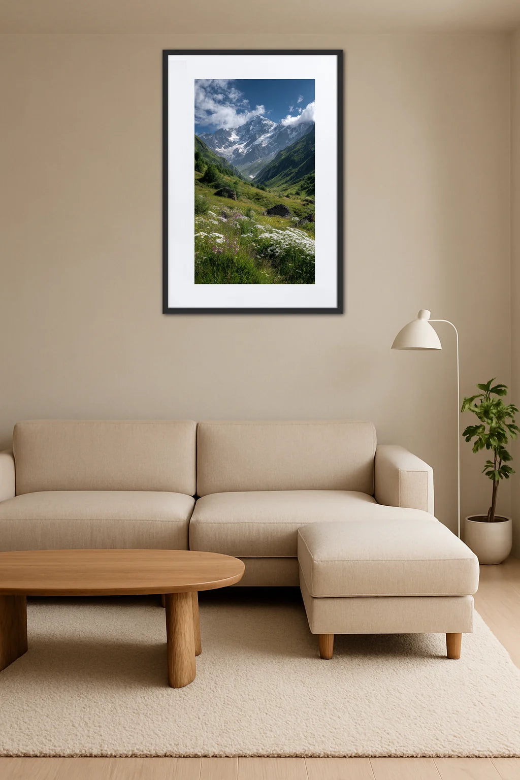 - Immersion visuelle: Les détails précis des sommets enneigés et des prairies fleuries offrent une profondeur qui capte le regard. Cette richesse visuelle éveille une sensation de sérénité, comme une pause apaisante dans un quotidien souvent agité.