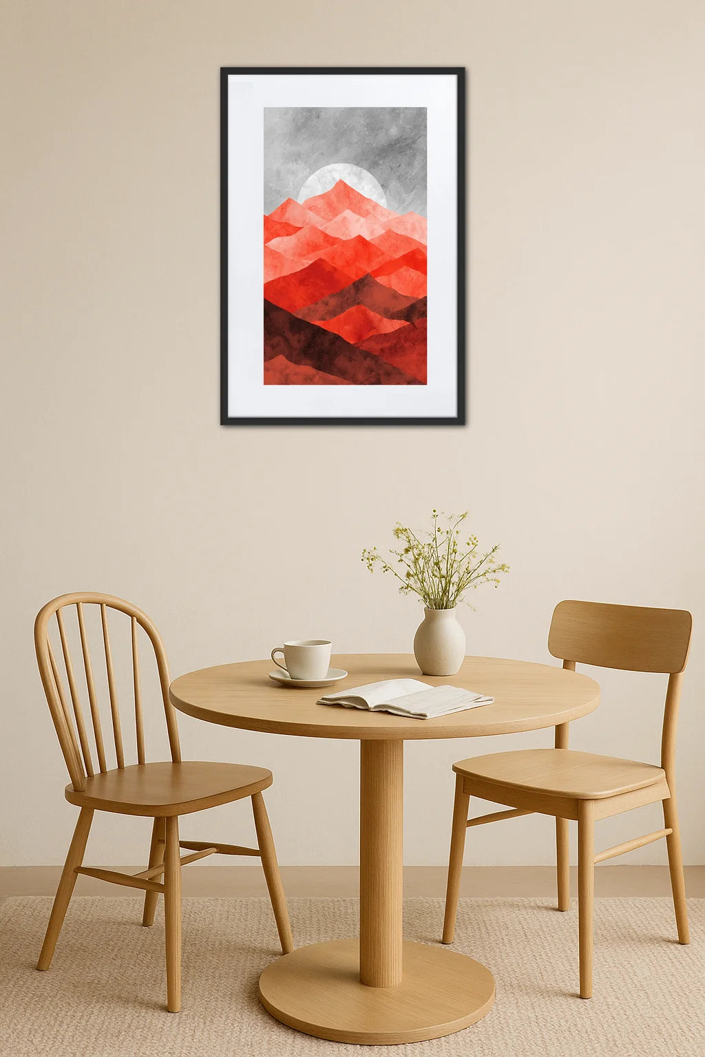 - Une profondeur visuelle intense : Les multiples plans rouges créent un effet de relief qui capte le regard et invite à la rêverie. Cette profondeur procure une sensation d’évasion, comme si l’on pouvait pénétrer au cœur des montagnes enflammées et ressentir leur énergie vibrante.