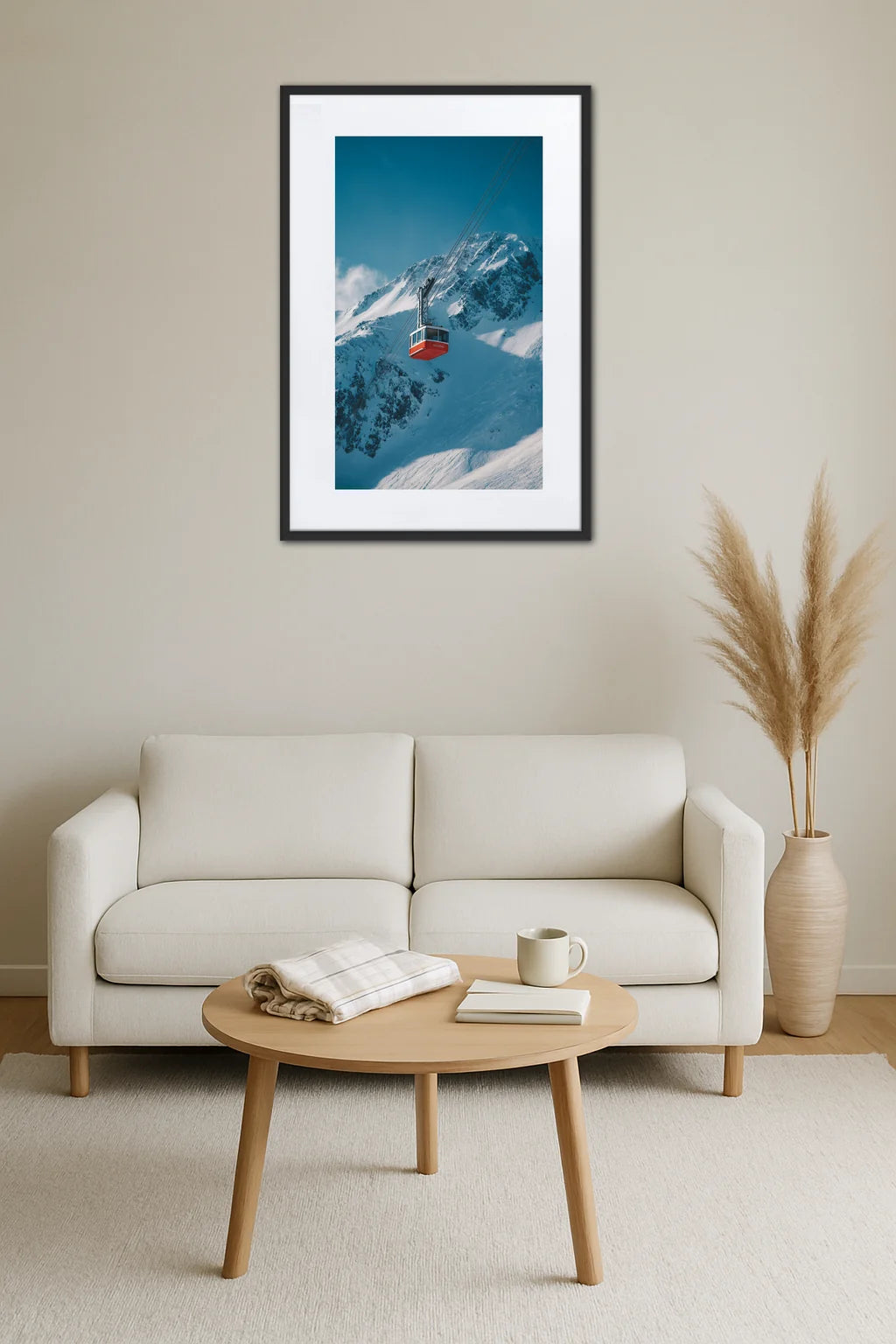 - Éclat vibrant et audace : La cabine rouge suspendue au-dessus des pics enneigés offre une touche de chaleur et de vitalité dans un décor majestueusement froid. Cette présence vive et dynamique évoque la détermination humaine face à la nature, insufflant un sentiment de courage et d’aventure. Visuellement, ce point rouge attire et guide le regard, tandis qu’émotionnellement, il rappelle la force tranquille des exploits en haute altitude, éveillant un désir d’évasion et de découverte.
