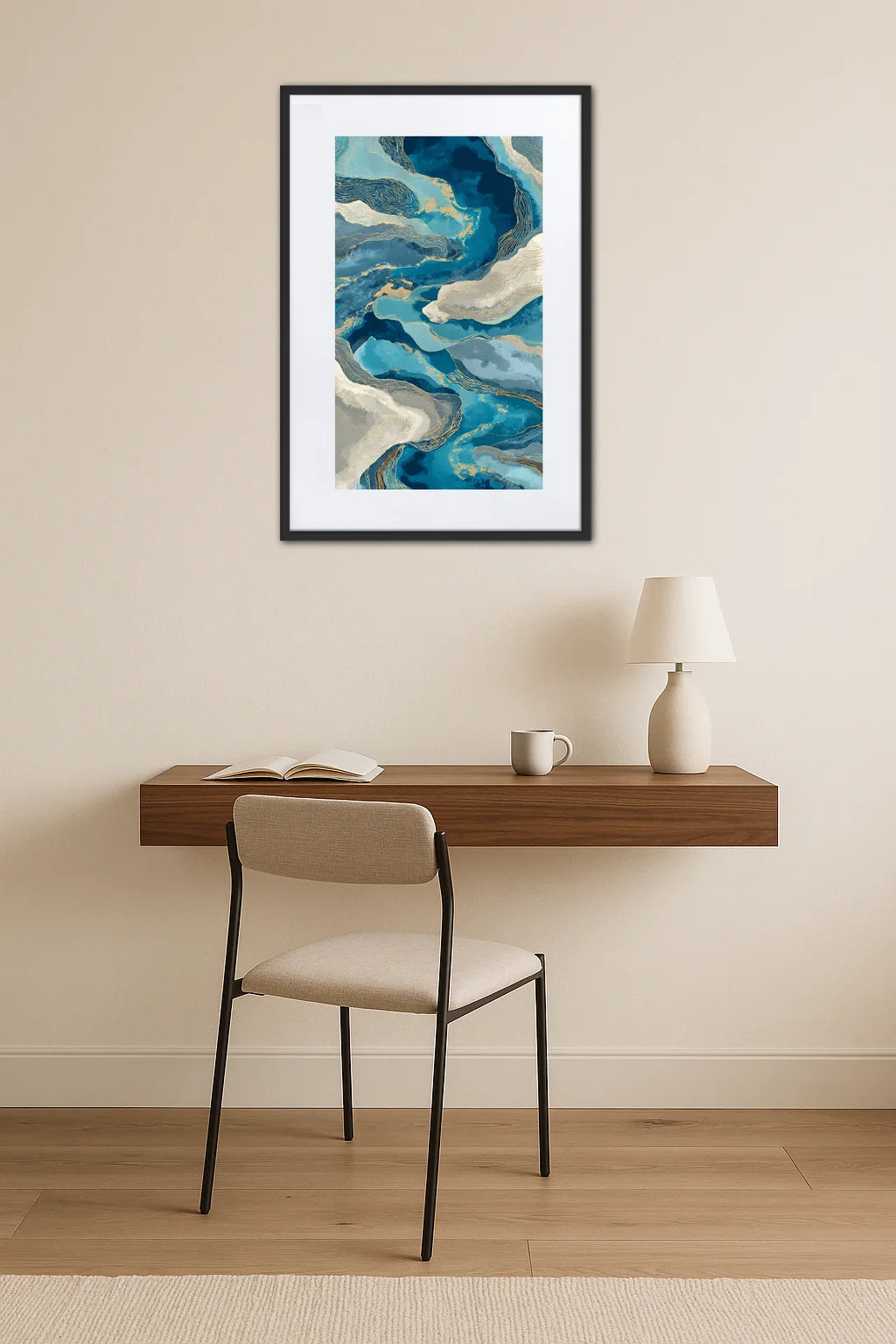 Cet ouvrage artistique puise son inspiration dans les mouvements perpétuels des courants marins, ces forces invisibles qui façonnent les rivages et éveillent les émotions. Par ses formes fluides et ses contrastes subtils, il évoque la poésie des eaux qui se mêlent et se séparent dans une chorégraphie naturelle. La mer, symbole universel d'infini et de mystère, est ici revisitée à travers une interprétation contemporaine où chaque teinte révèle une facette de son caractère insaisissable. Le bleu profond dialogue avec des nuances plus claires pour suggérer la profondeur et la transparence, tandis que des touches d’or rappellent les rayons du soleil jouant sur la surface de l’eau. Ce tableau ne se contente pas de représenter la mer, il en capture l’âme, cette énergie mouvante qui apaise et stimule à la fois. Il incarne une invitation à s’évader, à ressentir les embruns et le vent, à se laisser porter par le rythme naturel de la vie. L’alliance des formes organiques et des couleurs harmonieuses crée une atmosphère à la fois élégante et vivante, propre à enrichir un intérieur d’une touche de rêve et de sophistication. Plus qu’une simple décoration, cette œuvre est un voyage sensoriel qui célèbre la beauté et la puissance du monde marin sous un jour inédit.