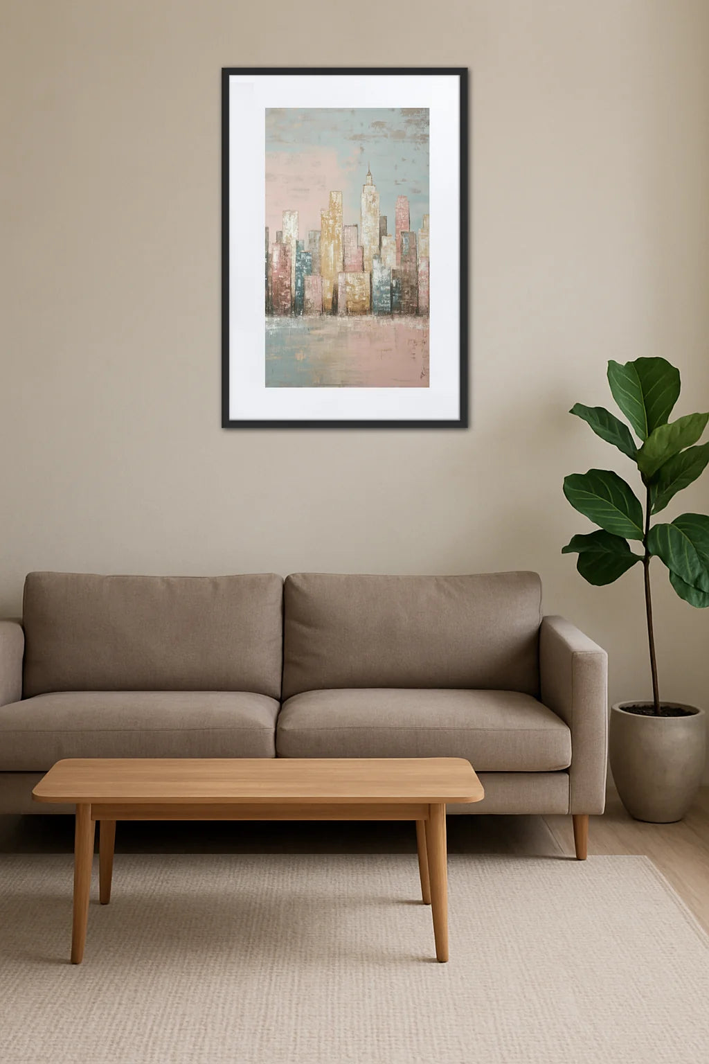 Ce tableau incarne un hommage à New York, cette métropole aux mille visages qui ne cesse de fasciner. L’artiste a choisi d’embrasser la silhouette emblématique de ses gratte-ciels, non pas dans un réalisme rigoureux, mais en révélant leur essence à travers des formes légèrement estompées et des teintes chaleureuses et apaisantes. Les tons roses, dorés et bleutés se mêlent pour créer une atmosphère douce, presque onirique, où la frénésie citadine semble suspendue dans le temps. La composition joue avec la lumière et la matière, évoquant la texture rugueuse des façades tout en suggérant la légèreté d’un rêve éveillé. Au-delà d’une simple représentation, cette œuvre évoque la complexité d’une ville où se croisent cultures, émotions et histoires personnelles. Elle invite à ressentir cette énergie unique, mêlée de mélancolie et d’espoir, qui fait battre le cœur de New York. Plus qu’un décor, ce tableau devient un compagnon de pensées, un espace où chaque regard peut trouver une nouvelle nuance, un nouveau souffle. L’expérience visuelle engage le spectateur dans un dialogue intime avec l’urbanité, la douceur et la force qui cohabitent en harmonie.