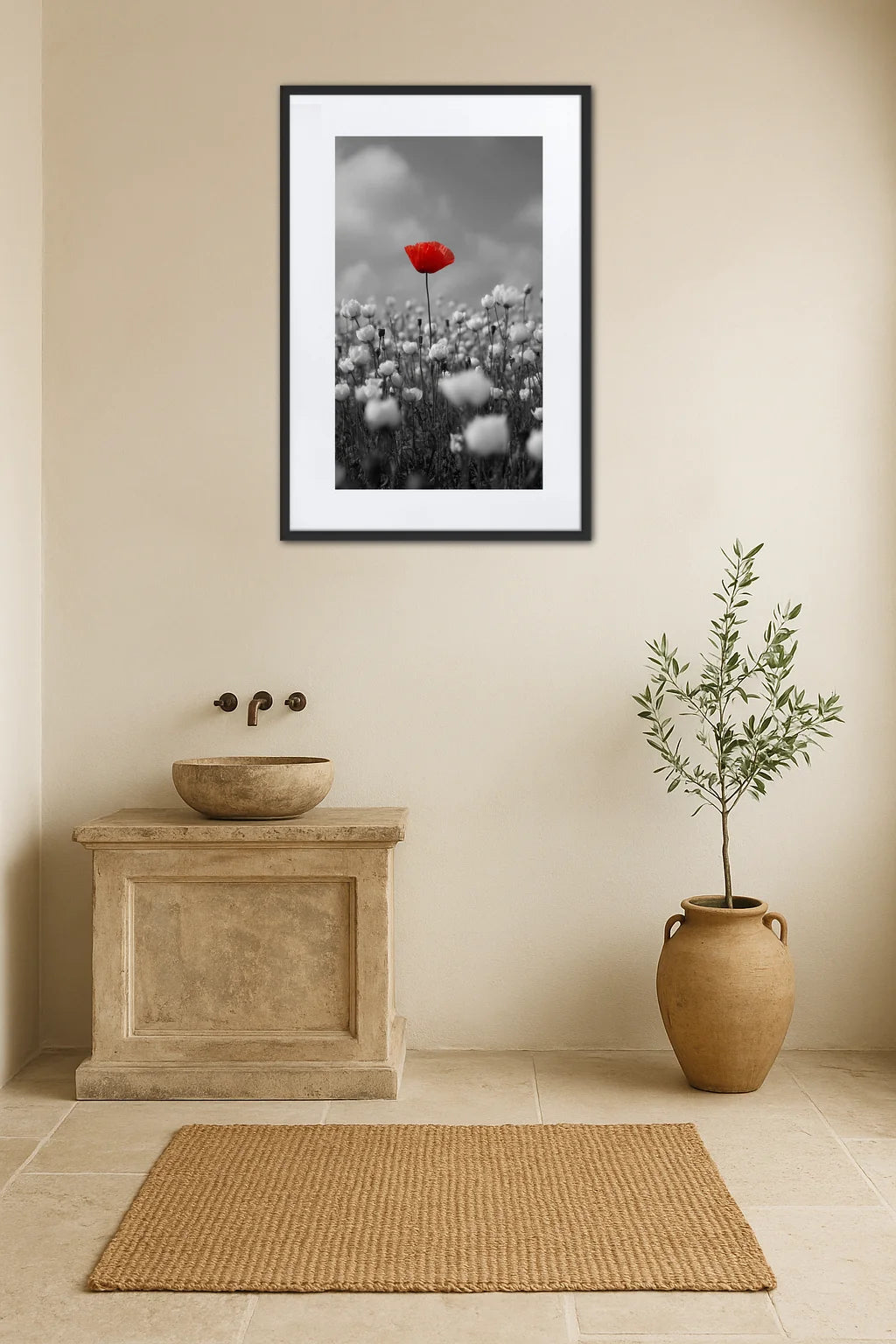 Ce tableau saisit l’essence même de la dualité entre sobriété et éclat, où une fleur rouge s’élève au-dessus d’un champ figé dans des nuances de noir et blanc. Elle incarne la force tranquille, la passion discrète qui perce à travers la neutralité environnante. Chaque élément, de cette fleur à la texture floue des autres fleurs, dialogue avec le regardeur, évoquant une histoire personnelle et universelle à la fois. L’univers de l’œuvre s’inspire des grandes traditions artistiques qui jouent sur le contraste pour révéler l’essentiel. Ici, le rouge n’est pas qu’une couleur, il est un symbole d’espoir, de vie et d’audace au milieu du calme monochrome. Cette image invite à la méditation sur ce qui fait vibrer l’âme, sur cette touche de singularité qui transcende le quotidien. En s’imposant au centre, la fleur rouge devient une icône moderne, une déclaration subtile mais puissante qui dépasse le cadre du simple décor. Elle invite à une lecture multiple, entre poésie visuelle et expression d’une énergie retenue, qui trouve son éclat dans cette alliance entre nuances et intensité. Cette œuvre est une ode à la beauté des contrastes, à la richesse des émotions que le regard peut capter sans un mot.