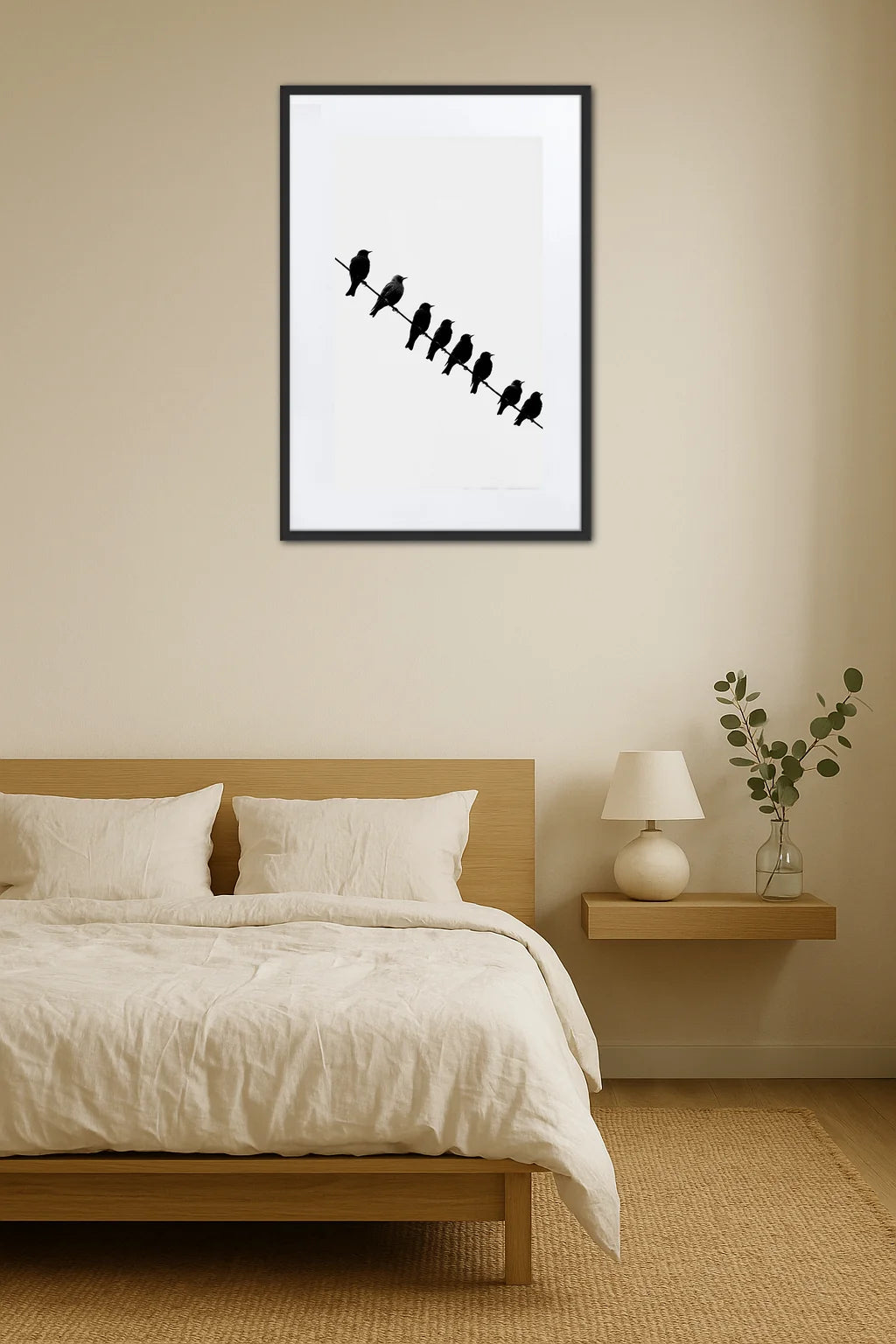 Cette œuvre singulière s’impose comme une ode à la délicatesse et à l’équilibre. Sur un fond immaculé, sept oiseaux se posent avec grâce sur un fil, dessinant une diagonale qui semble suspendre le mouvement du temps. Chaque silhouette noire, parfaitement ciselée, joue avec le vide et l’espace, transformant la simplicité apparente en une véritable composition visuelle. Ce tableau évoque plus qu’une scène, il capte un instant suspendu entre présence et absence, solitude et communauté. Le choix du noir et blanc, loin d’être un simple contraste, explore la richesse des formes épurées et la poésie des lignes. Dans une chambre, ce tableau devient une fenêtre vers un monde où le calme et la réflexion se mêlent, invitant à la méditation sur la beauté des choses simples et sur la force des petites scènes de la vie quotidienne. Inspiré par la nature et l’esthétique minimaliste, il transcende le décor pour devenir un compagnon discret et élégant de vos instants de repos et de rêve.