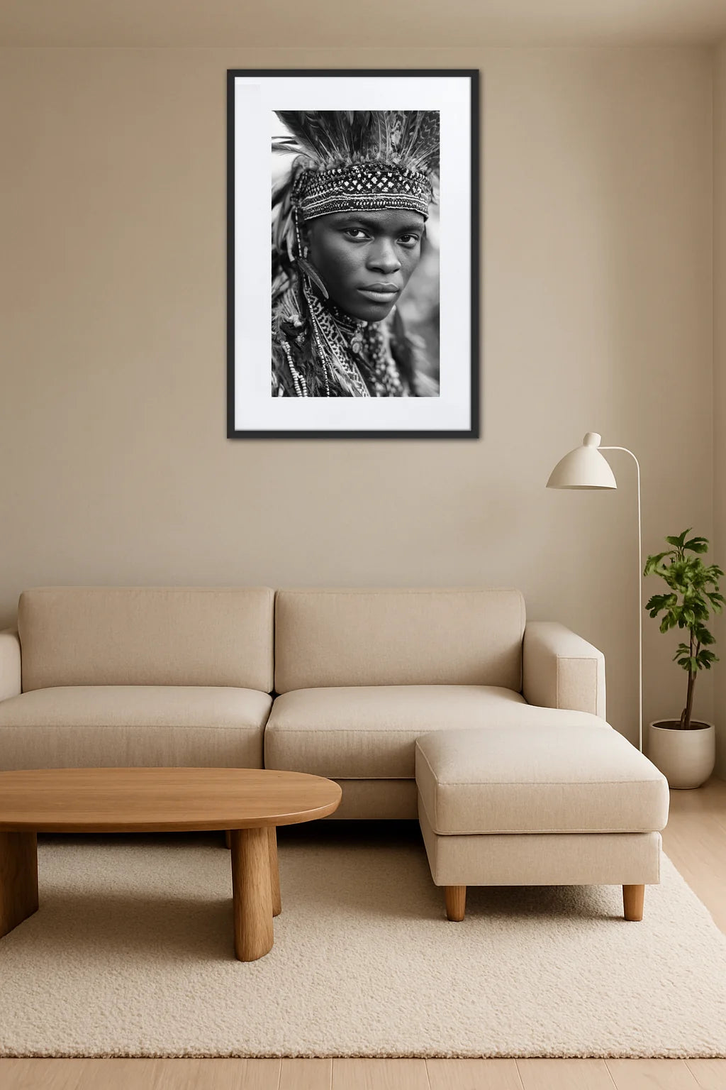 Ce tableau incarne une rencontre entre une tradition ancestrale et une esthétique contemporaine, où le noir et blanc transcendent le temps. L'image restitue avec une justesse rare l'expression d'une culture riche, capturée dans les traits d'un visage empreint de dignité et de mystère. Les ornements délicats et les plumes qui couronnent la tête racontent des récits d'appartenance, de rites et d'héritage, tissant un lien entre passé et présent. L'intensité du regard invite à une contemplation introspective, presque comme un dialogue silencieux avec l'âme de celui ou celle qui se dévoile. Plus qu'une simple représentation, ce tableau est un hommage à la diversité des identités, à la beauté des contrastes qui façonnent notre humanité. Il invite à ressentir la profondeur d'une culture, à percevoir la force tranquille qui émane de ces symboles, tout en célébrant la simplicité élégante d'une composition épurée. Ainsi, il trouve sa place dans un intérieur contemporain, apportant une note de poésie et de réflexion, tout en éveillant une émotion authentique et durable.