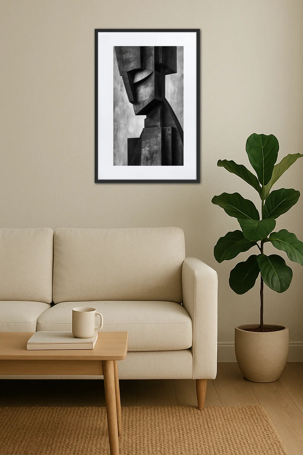 Cette œuvre puise son essence dans une quête d’équilibre entre formes géométriques et émotions humaines. Le visage stylisé, fragmenté en volumes anguleux, évoque une figure qui semble à la fois présente et distante, comme un souvenir figé dans le temps. Le noir profond et le blanc lumineux dialoguent pour créer une tension visuelle, donnant vie à une silhouette qui semble émerger d’un rêve ou d’une réflexion intérieure. Ce tableau transcende la simple représentation figurative pour explorer la profondeur de l’âme humaine à travers un prisme d’abstraction. Chaque trait, chaque ombre, chaque espace blanc contribue à créer un univers où la dualité entre ombre et lumière devient métaphore des contradictions de la condition humaine. L’œuvre évoque autant la rigueur des formes classiques que la modernité d’une esthétique épurée, témoignant d’une culture artistique riche et d’un regard contemporain sur l’art. En suspendant le temps, elle invite à un voyage intérieur, à une pause où la beauté se révèle dans la tension et la douceur des contrastes. Ainsi, elle parle autant au cœur qu’à l’esprit, ouvrant un dialogue silencieux mais intense entre le spectateur et la toile.